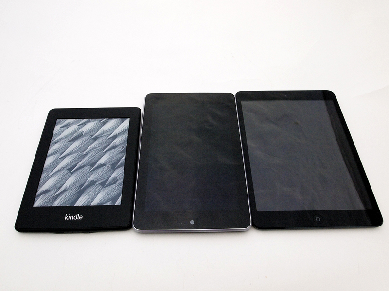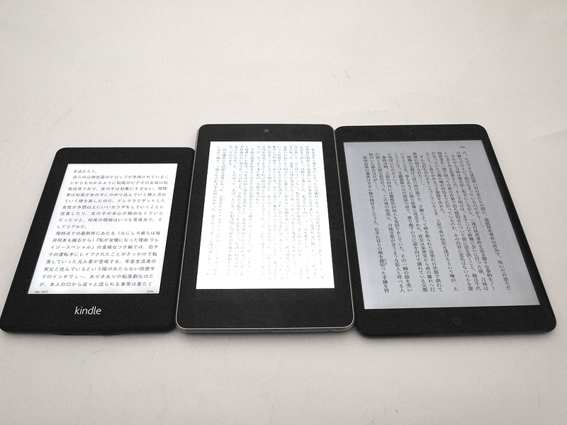 ●読書環境としてのタブレット評価 iPad miniやKindle paperwhite、Nexus 7といった、手に取りやすいサイズと価格のタブレットが登場して、何となく電子書籍の土台が出来上がったような気分になりそうだけど、実際は、端末が出てきただけで、マーケットとしての電子書籍がどうにかなったわけではない。どころか、買った本はいつまで読むことができるのかとか、版面のデザインはどうするのかとか、製本の都合で上下巻になっていたものを何故電子書籍でも分冊して売るのかとか、何故、すべての新刊は紙の本と同時に電子書籍化されないのかとか、本によって買いに行く場所が違うのはどうにかならないのかとか、何千冊と購入した時の管理はどうすればよいのかといった、読者側からの要望や疑問は、何一つ解決していないのが現状だ。 その状況の中で魅力的な端末が登場するのだから、ユーザーは自分がすでに持っている本を、自らデジタル化して、それらの端末で読もうと考えるのは、しょうがないというか当然と言うか。実際のところ、どこかのメーカーが、テキストとPDFとJPEGなどの画像の圧縮ファイルとEPUBとドットブックが読める、7インチの高精細液晶に内部128GB、SDメモリーカードスロット付きのタブレットを1万円くらいで出せば、爆発的に売れるような気もするのだけど、そういうモノが出る気配もなく、また、紙の雑誌では書籍のデジタル化の記事が書きにくい状況にあったりと、自分でデジタル化する道も、あまり平坦なものではなかったりする。 などと愚痴を言っていてもしょうがないし、筆者はすでに、タブレットでの読書量が紙のそれを上回っているのだし、「読書環境」として、iPad mini、Kindle paperwhite、Nexus 7を比較してみようと考えた(写真01、02、03)。デジタル機器としてどうかとか、ネット端末としてどうかは置いておいて、ひたすら、本を読む環境としてのみの評価。そういう地道な使い比べから、もしかしたら、デジタル化された本を読む環境の正しい姿が見えてくるかも知れないと思うのだ。とりあえず、現状の、マーケットとしての電子書籍議論とは離れたところで、普通に、大量の本を持ち歩いて、好きな時に好きな場所で好きな本を選んで読める、という状況が嬉しいと主張しておきたいのだ。