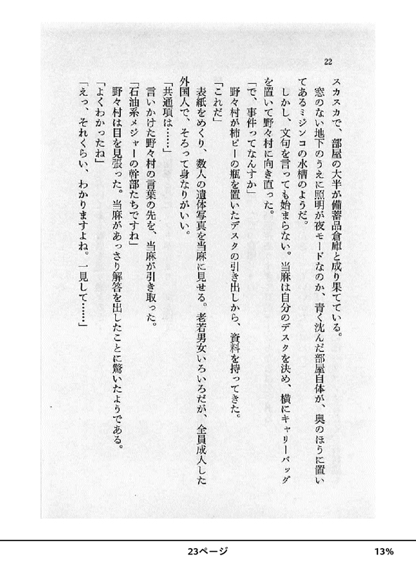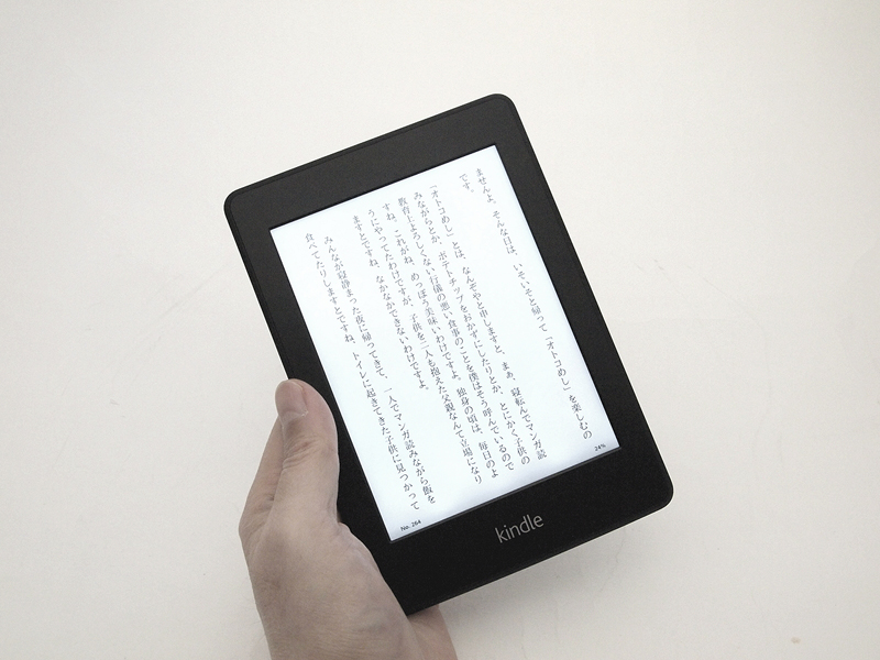 ●Kindle paperwhiteの場合(写真07) と、大仰な事を言いつつ、やっているのは大量の本をいろいろなタブレットを持ち歩いて、あちこちで読む、というだけなのだが、そうやって大量に読んでいて気がついたことがいくつかある。まず、kindle paperwhite(写真04)などで採用されているE-inkは、本当に目に優しいのかということ。かつて、光らないから目が疲れないと言われていたけれど、光らないとかなり明るいところで読まないと、背景と文字のコントラストが低く、文字がスムーズに頭に入ってこないことがあった。そのあたりが改良されて、paperwhiteではなるべく白い背景と、サイドライトによる照明を採用。確かに読み易くなったのだけど、結局光っているわけで、間接照明ではあるけれど、輝度を落としたiPad miniと比べた場合、コントラストが低めで読むのに力が入る分、paperwhiteの方が疲れるような気がしたのだ。 もっとも、paperwhiteの場合、ページめくりが遅いとか、じわっと表示が変わったり、数ページおきに画面が白黒反転したりと、「読む」作業に集中できないことが多く、そのせいで疲れるということもあると思われるから、一概に液晶画面とE-inkの比較にはならないのだが。それを考えに入れたとしても、大量に読む場合、見やすさの点では、それほどE-inkが見やすいとは思えなかったのだ。そして、paperwhite最大のネックは、購入した電子書籍以外のビューワーとしては、あまり使えないこと(写真05)。特に、テキストファイルの縦書き表示とPDFファイルの右開きに対応していないのは痛い。というか、このあたり、初代のkindleではできていたわけで、機能的に後退しているのだ。初代kindleにはSDカードも入れられたし。端末間でしおりを共有できる機能も、自作のファイルでも使えるようにするのは難しくなさそうなのだけど、実装される気がしない。まあ、自作のファイルと電子書籍マーケットは今のところ相容れないのだろうから、仕方ないのかも知れないが、端末の機能の可能性としては残念でならない。それと、全体の動作の遅さも気になる。シンプルで単機能の端末であるからには、快適な速度で動くことはとても重要。初心者向けほど速度が速い方がよいというのは、デジタル業界の常識であるにも関わらず、実際の製品には反映しにくい部分、という状況も、長いこと変わらない問題でもある。 そんなことよりも、paperwhiteの魅力は、その軽さであったり、背面のラバーっぽい感触からくる丈夫っぽさ(写真06)、ペーパーバックを読んでいるような気軽さ、画面のざらっとした手触りからくるよい意味での粗っぽさといった、「モノ」として、読書するための道具としての「感触」にあると思うのだ。取り落としても平気っぽい感じは、歩きながら読んだりするのにも最適で、本来、ある程度ぞんざいに扱っても大丈夫な「紙の本」と同じ、よい意味でのチープさが、他の端末にはない魅力だと思うのだ。だからこそ、自分でデジタル化したファイルへの対応の悪さが残念だ。あと、直接USBでパソコンにつなぐか、メール経由でしか自作のファイルを読み込ませられないのも悲しい。ここは、FTPとかWebサーバー経由でもよいから、直接無線でやり取りしたいところ。どうせ、自分のファイルを読み込ませたい人はマニアなんだから、作業そのものが楽なら、手法は多少レガシーなスタイルでも構わないのだ。
