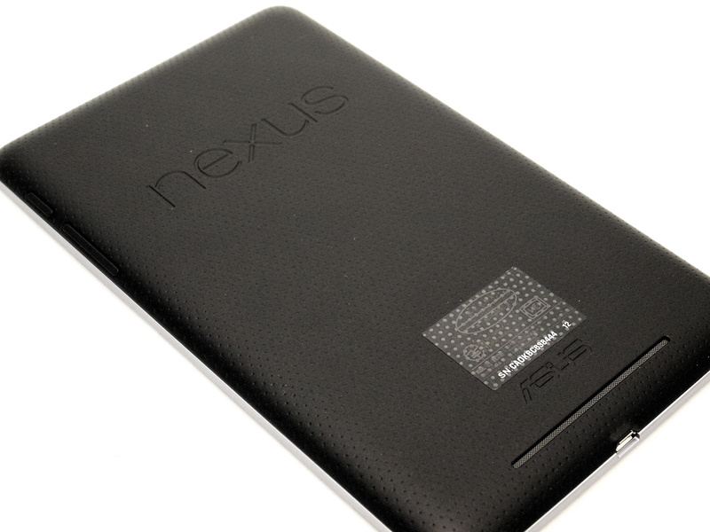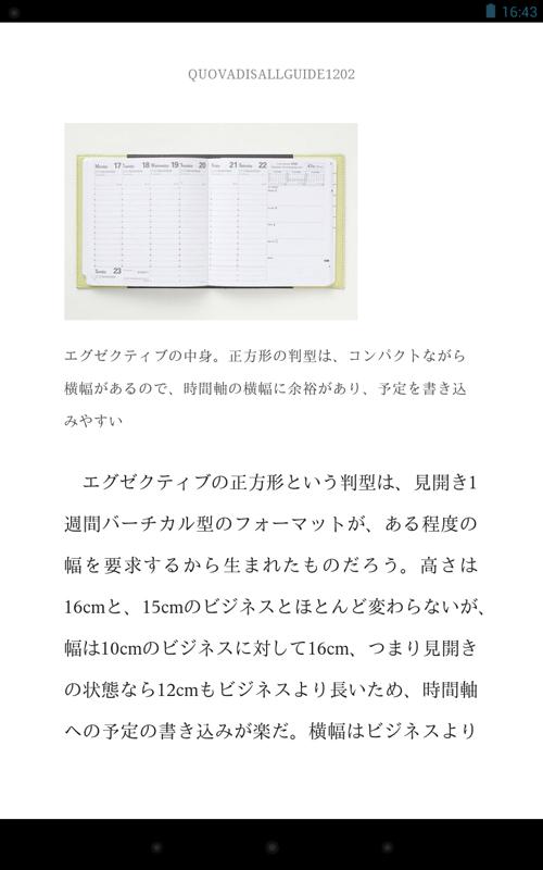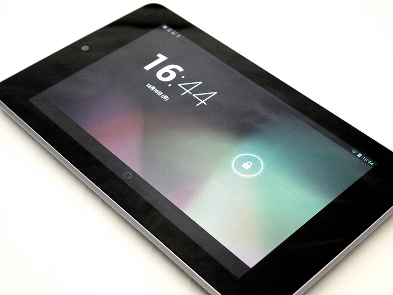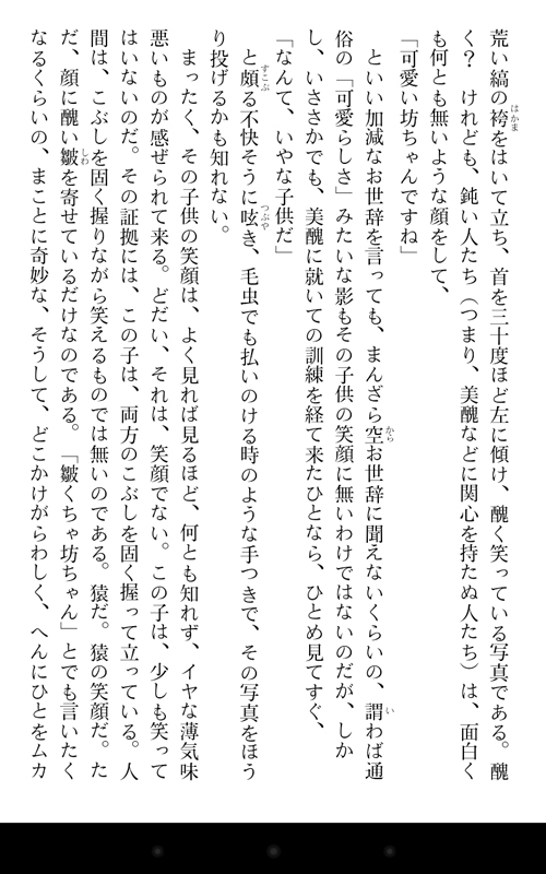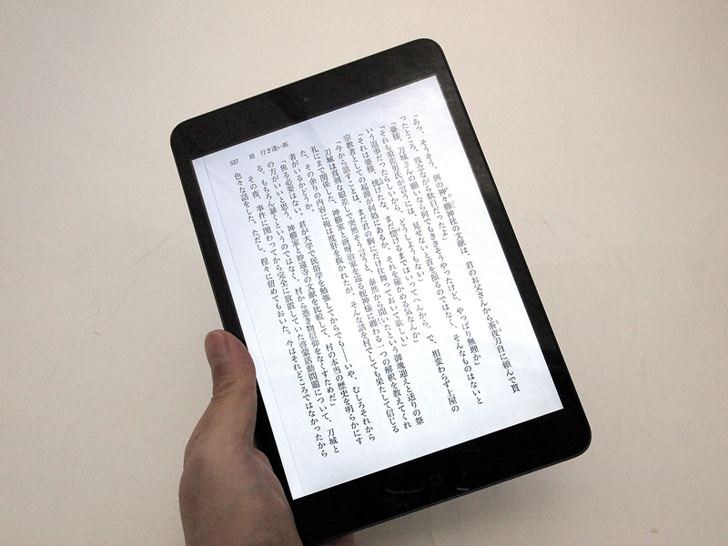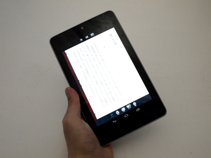 ●Nexus 7の場合(写真08) 一方で、Nexus 7は、読書端末としてだけ見ると、あまり欠点が見当たらない。ただ、PDFやテキストファイルを読むためのリーダーアプリが、今一充実していないことや、iPadのキラーアプリでもある「i文庫HD」のAndroid版は、かなり操作性が悪いこと、Android準拠の操作感があまり直感的ではないこと、などなど、自作ファイルを読む環境が、外部的に整っていないのが残念(もっとも、試用期間が2週間と短かったため、私が気がついていないだけで、とても優秀なビューワーなどがあるのかもしれないが)。また、初期設定で画面が明る過ぎて、パッと見は読みやすいけれど、読んでいる内に疲れてくるので、まずは、画面の輝度を暗くするところから始める必要がある(個人差はあると思います)。 画面がやけに縦長い印象があるため、新書とかをデジタル化したものと相性がよい。画面を横にして見開き表示にすると、上下が短過ぎて、ちょっと変なレイアウトになるので、縦持ち専用という感じ。kindleでPDFファイルを横持ちで表示すると、画面上部しか表示されなくて困ったものだが、これは、Nexus 7のせいではなく、やはり、Kindleというかamazonは自作データの表示には積極的ではないということだろう。本体サイズの割に画面は小さく感じるが、文庫や新書を読むのと感覚は変わらない(写真09)。裏面(写真10)が見た目はともかく滑りにくくて、表も額縁部分が広いせいで保持しやすい(写真11)が、実際に他のタブレットと使い比べた場合、そのメリットはそれほど大きくないと言うか、Nexus 7はちょっと厚くて、それは持つのに困る厚みではないけれど、iPad miniの「この薄い板のようなもので、普通に読書できてしまう驚きと快適」といった体験に比べると、やや平凡な印象になってしまう。 あと、これはiPad miniも同じだけれど、読書端末として考えると、画面がピカピカし過ぎてるので、アンチグレアタイプの画面保護シートを貼りたい。画面の反射が減るだけで、読みやすさは一気に向上する。それと、Nexus 7は、速度にムラがあるというか、ページめくりは快適なのに、拡大縮小がスムーズでなかったり、メニューの表示や設定などの操作のレスポンスが悪いなど、ところどころ動作がもたつくところがある。特に、本を次々と取り替えて読みたい場合の表示速度に難があるが、これも本体と言うよりアプリの問題なのかも知れない。つまり、AndroidというOSに不満がなければ、Nexus7は、ハードウェアとしては中々優れていると思うのだ。特にコストパフォーマンスは相当高い。問題は、自分で作った書籍のデータを読む、という点での読書環境が整っていないこと。電子書籍マーケットからの購入、読書はスムーズだし、ページめくりはキビキビと動くので速読にも耐える。