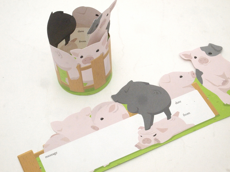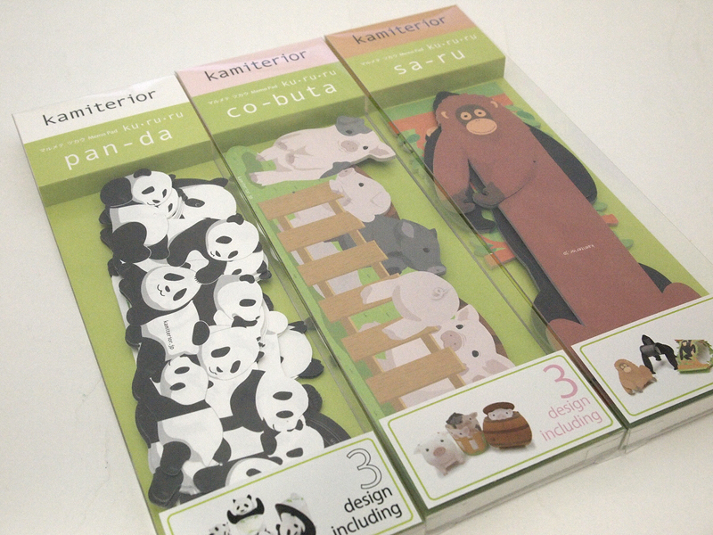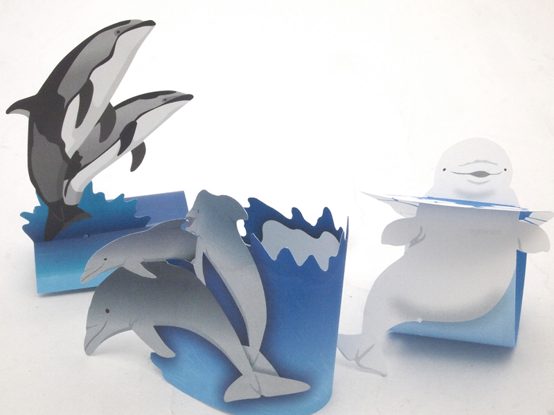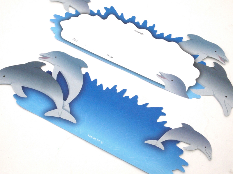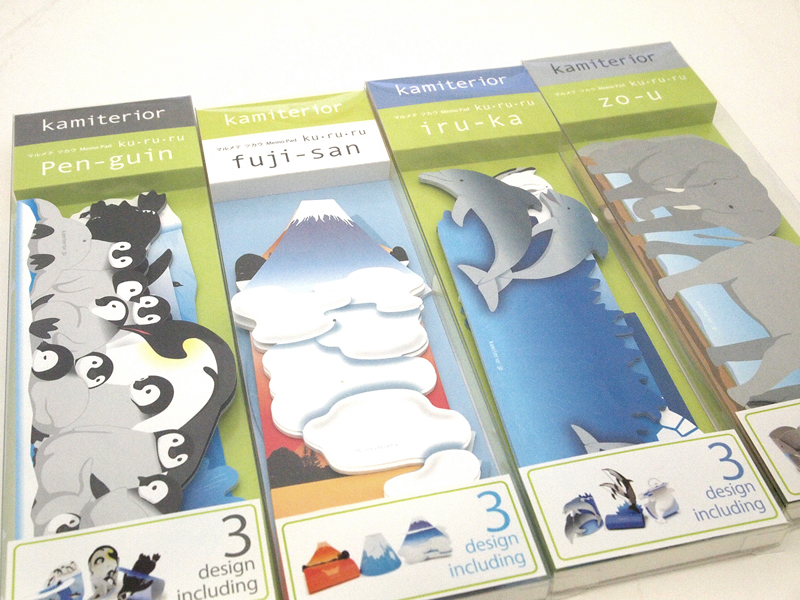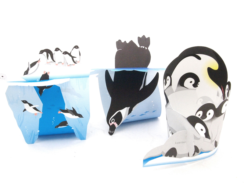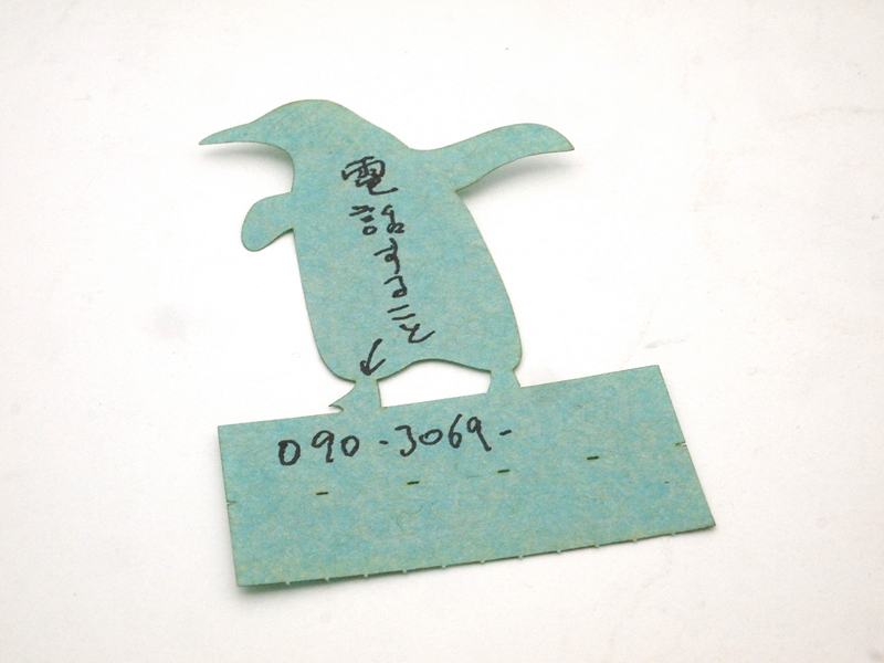 ●メモを過剰に演出する事で新しいビジネスを生む「kamiteria ku-ru-ru」 一方、ペーパリーの「kamiteria ku-ru-ru」シリーズ(写真7、8)は、紙は、巻いたり曲げたりすると立体物にもなる、という紙のハードウェア性を強調したメモ用紙(写真9)。こちらは、書いたメモを内容を隠しつつ、目立つ状況で相手に渡す、といったシチュエーション用に作られたメモ用紙。似た製品が最近増えているけれど、この「kamiteria ku-ru-ru」は、それらの先駆けとなる製品だ。しかも、折って隠すとか、折って別の形を見せる、といった単純なモノではなく、「くるくると丸めると、ペーパークラフト的な立体物ができ上がる」という、かなり最先端を行く紙製品なのだ。 発売当初は、巻くと面白そう、といったシンプルな発想で作られた感じで、それは「紙」というハードウェアに着目したというよりも、メモ用紙の別の可能性に向けての実験、といった位置付けだったのだと思う。初期の製品のあっさりした単純さを見ても、そう思う。しかし、いつからか、デザインが良い意味で暴走し、動物の姿を立体的に見せる程度だったデザインは、動物のいる風景になり、動物が動く一瞬の動作になり、それらを組み合わせたジオラマ的なモノになっていった。 それが、とても展開として面白いのだ。ペンギンやイルカが、寄り添い、遊び、躍動する様子が、くるっと紙を巻いて、切り込みに差し込むだけででき上がってしまう(写真10、11)、その変形の面白さは、「紙」の特性をフルに使ったモノで、その工作過程を含めて、「紙を触る」面白さに満ちている。糊とか使わないから、読んだメモは、そのままどっかに挟んで持ち帰り、家で組み立ててコレクションしたりもできる。デジタルのカード集めよりはるかに充実感があるのは、やはり「紙」のモノとしての強さだろう。手に取れる、自分の手で組立て解体ができる、という魅力はとても大きい。しかも、でき上がりは魅力的だし、メモ用紙としても書くスペースがきちんと確保されていて、さらに筆記箇所は四角のスペースを崩さないデザイン(写真12)だから書き易く読みやすい。