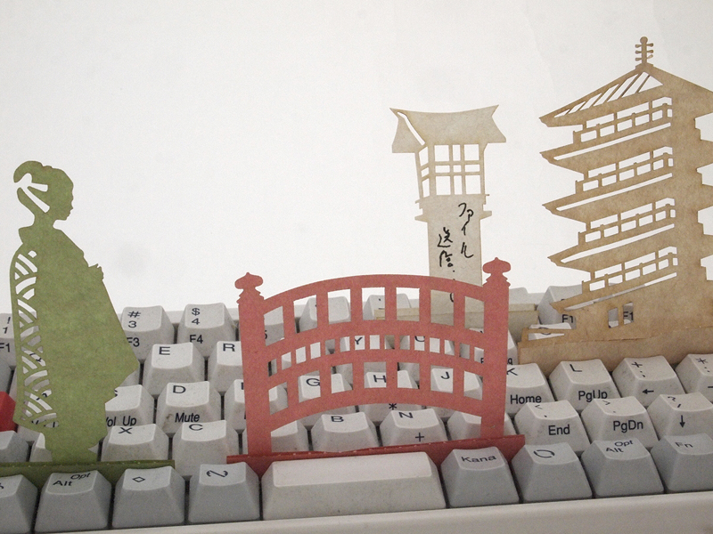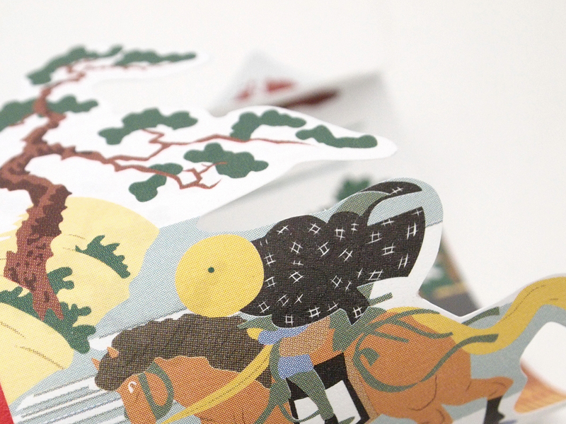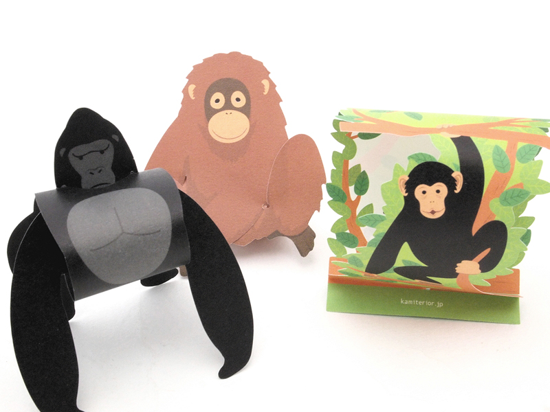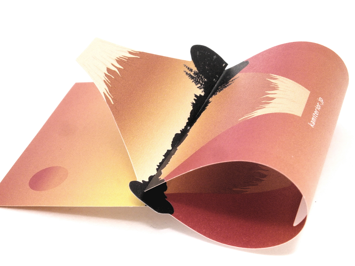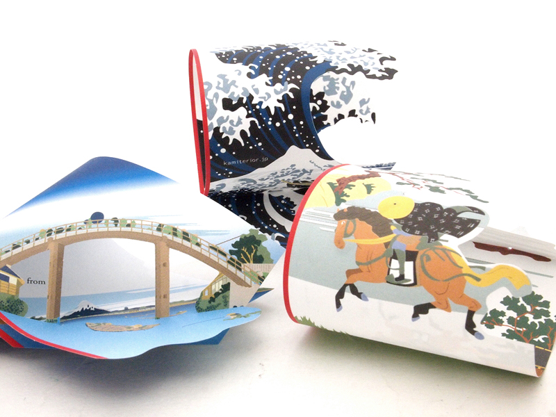 特筆すべきは、「ukiyo-e」という製品。葛飾北斎の富嶽三十六景から「神奈川沖波裏」「深川万年橋下」「隅田川関屋の里」の3つの作品を、巻けば立体化するメモ用紙に仕立てている(写真16)。通常、この手の製品は、おじさんが使い難いデザインのものが多いのだが、この「ukiyo-e」なら、おじさんも安心して楽しめる。お年寄りにだって、外国人にだって喜んでもらえそうだ。「deng-on」の古都シリーズもそうだが、紙と和のテイストは相性が良いのかもしれない。その「ukiyo-e」だが、もはや従来の、紙で立体物を作るというコンセプトをさらに一歩進めて、二次元の「絵」を、巻く事で三次元化する、というスタイルにまで来てしまっている。 富嶽三十六景という作品は、意外にもというか、当然というか、その主役であるはずの富士山が大きく描かれた作品はとても少ない。あっちこっちから見える富士山を描くというシリーズで、眼目は、その富士山が見える場所の風景だから、富士山は遠くにちょこっと見える、という絵がほとんどなのだ。「ukiyo-e」では、それを上手く利用して、遠くに見える富士山を、本当に「遠く」に配置する。立体化することで、前景である富士山が見える場所と、遠景である富士山を、実際に分けて見せることができるのだ(写真17)。これが、何とも作品にリアリティを与えていて、「遠くに富士山が見える風景」というパノラマが、見事に立体化しているのだ。実際、写真に撮ると、前景にピントを合わせると富士山が見事にボケる。遠い富士山のリアリティ。 遠近法ではなく、実際に遠くに配置することで「遠くに見える富士山」が完成する。それを、ただの細長いメモ用紙をくるっと巻いて切れ目同士を差し込むだけで実現している面白さ。1パッケージに、3種類全部入っているサービス精神も嬉しい。この「ukiyo-e」ほど極端ではないが、富士山そのものをモチーフにした「fuji-san」では、1つの形態で、上下別々の風景が楽しめるようになっていたり(写真18)、「sa-ru」のように、同じような巻いて差し込むというスタイルで、3種類の別々の立体感を見せたり(写真19)と、どの製品も紙の可能性を見せてくれるデザインになっている。その1つひとつの工夫を見るのも、製品の面白さになっているのだ。このあたり、多分デジタルでも感じられる人は感じられるのだけど、紙でシンプルな設計だと、誰にでも、構造の面白さが伝わる。「シンプルなハードウェアとしての紙」の魅力は、そこにもあると思う。