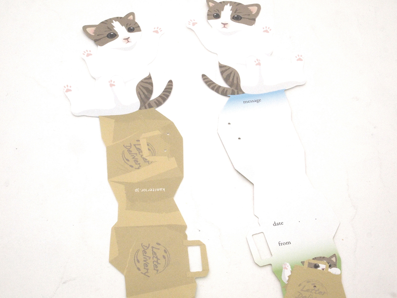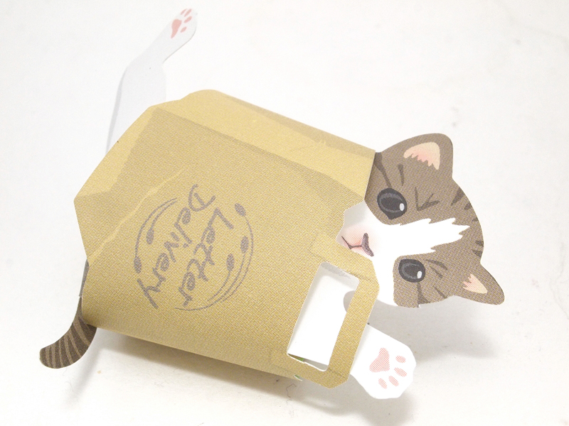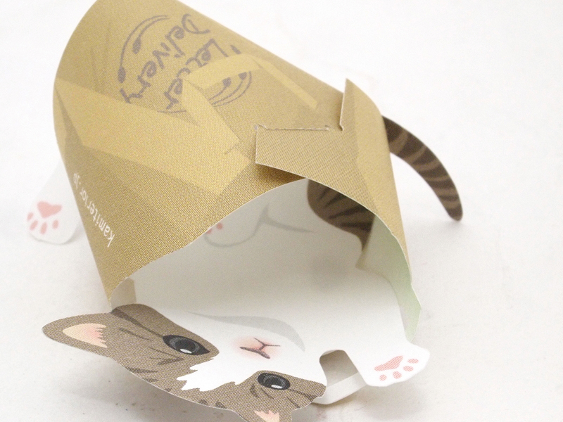 最近の製品、特に「co-neko」などは、もう組立ても難しくなっていて(写真13、14、15)、微妙に本末転倒というか、メモを渡すための組立て時に時間がかかったり失敗したりしそうなレベルなのだけど、特に極端な形ではないメモ用紙が、糊もハサミも使わずに、とても魅力的な立体物に変形する、という驚きが大きくなっているわけで、それはそれで製品コンセプトとして間違っていない。むしろ、組立ての難易度がデザインによって変わる、というスタイルもデジタルには不可能な、紙だからこそ当たり前に起こること。通常、ビジネスに三次元を扱うことは少ないため、組立てを楽しむことも頭の切替えになって良いものだ。