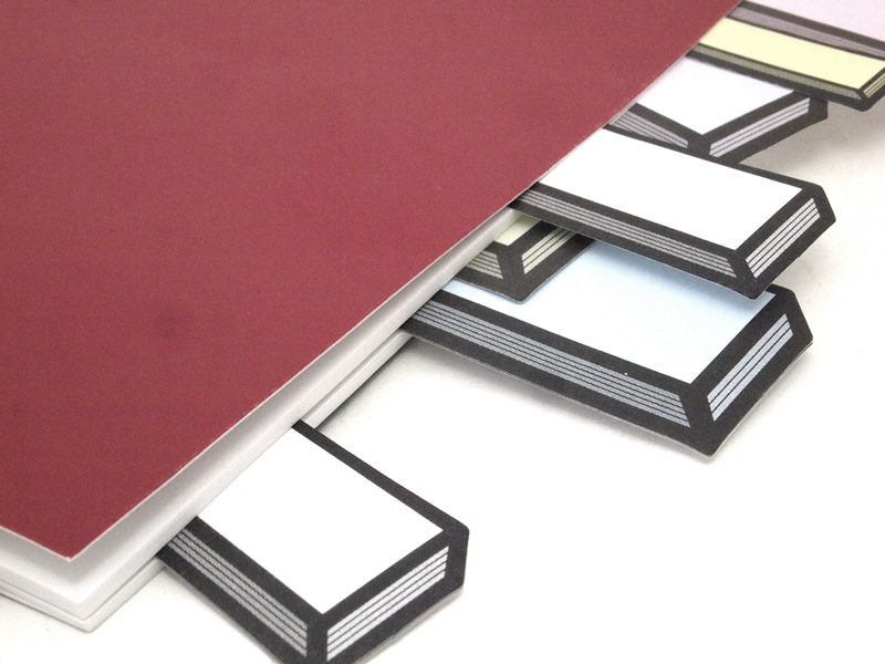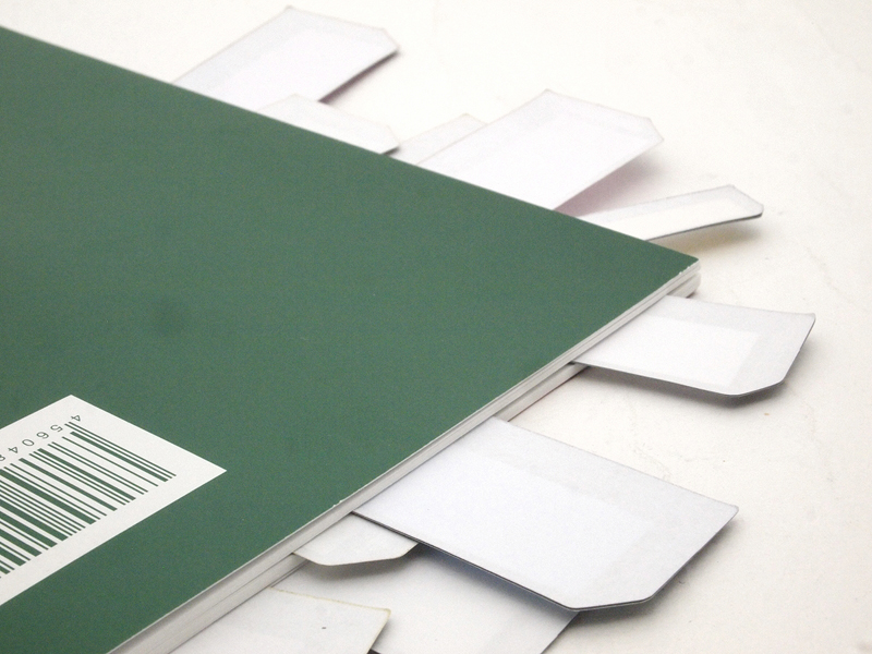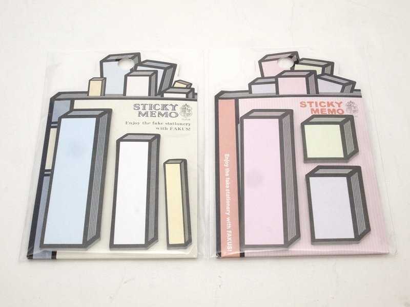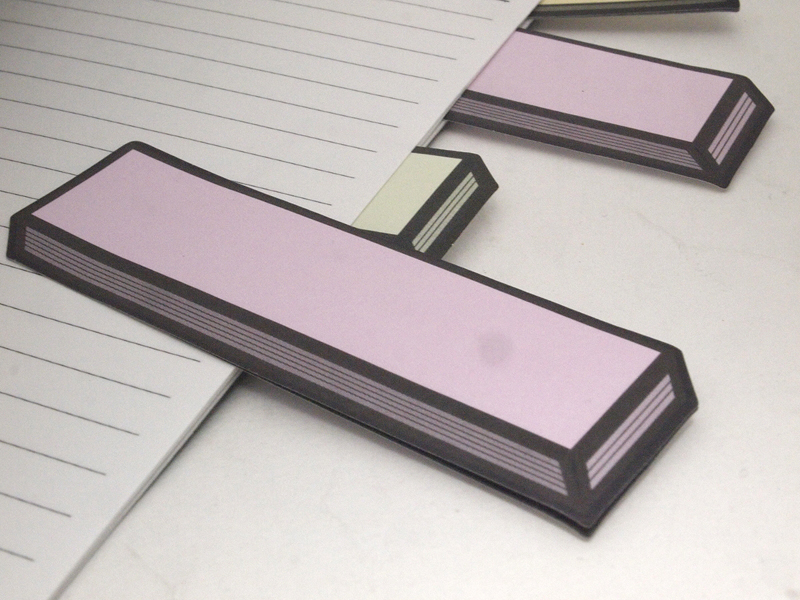 ●立体を模すふせん「フェイクス!ふせん」 サンスター文具の「フェイクス!ふせん」(写真20)は、基本的にはただのふせんだ。特に折ったり曲げたりすることもなく、普通にふせんとして使うモノだ。形も長方形だから、通常のふせんとまったく同じように使用できる。ただ、それが立体に見える。もちろん、錯視を応用したデザインで、まるで箱のように見せているだけだが、ノートのページとページの間から、ニュッと箱形のモノが飛び出して見えるインパクトの強さはかなりのもの(写真21)。ふせんの役割は、貼られたページを目立たせることなのだから、この製品はふせんとしてもとても優れているわけだ。 ふせんもメモと同じく、まだデジタルよりもアナログの方が優れているというか、アナログの世界の中で使うツール。そして、紙であることでさまざまな種類の製品が出ているジャンルでもあるけれど、こういう形で、錯視を利用して目立たせる、というパターンは意外になかった。そして、最初にも書いたように、紙は印刷することで、さまざまな「専用機」になるハードウェア。その特性を利用して、「立体に見える紙」をふせんとして使うアイデアが秀逸だ。 実際に、ノートに貼って使うと、本当に驚くくらい目立つ。そして、見慣れていても、ふと見た時、ちょっとビックリする。それくらい、ノートから立体物が飛び出している景色というのは、何とも不思議な光景なのだ(写真22、23)。そして錯視は、タネが割れていれば見えなくなる、というものではない。何度見ても、やっぱり飛び出して見えるわけで、だからずっと目立ち続けるのだ。それもまた、ふせんとして凄いものだ。もちろん、伝言メモ的なふせんとして使うことも可能だが、その性質上、文字を書くより、何も書かれていない状態で貼り付けてある方がインパクトは大きい。なので、目印用のふせんとして使うのが、この場合は正しい利用法だろう。 これらの、「紙」の面白さを機能に結びつけた製品は、どれも、性別年齢を問わずに使えるデザインになっている。それは、多分、「紙」の面白さと機能の結びつき自体が面白さになっているから、そこにターゲット的なモノを付加する必要がないからだろうと思う。それもまた、紙を味ではなく機能でデザインする製品の強み。デジタル用品が増えてきたからこそ、そういった「紙」自体の機能に目を向ける機会が増えているのだと思う。それはつまり、紙製品が大きく飛躍できるチャンスでもあると思うのだ。