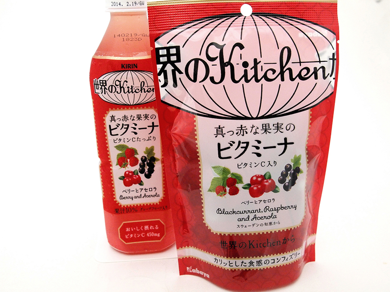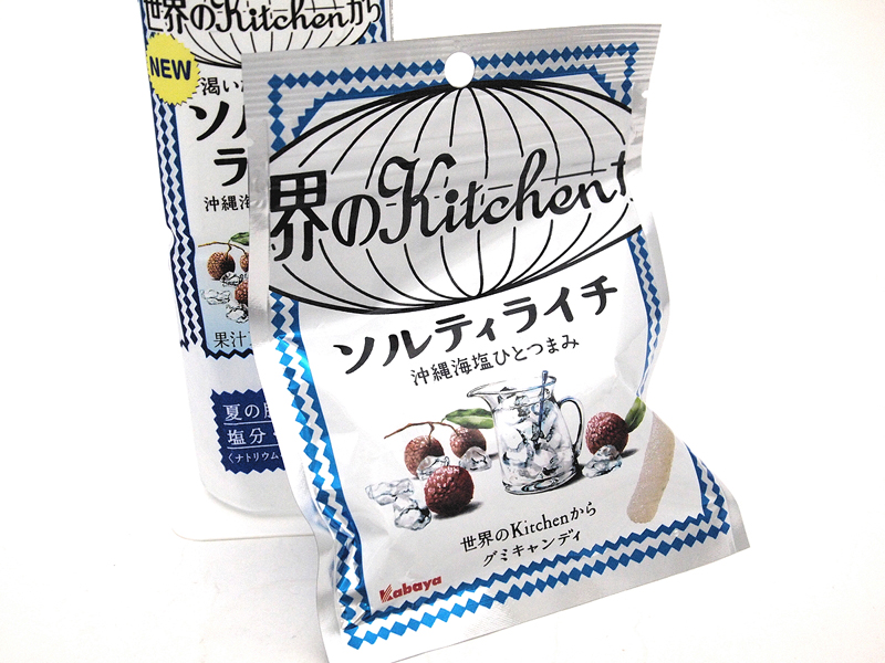 ●飲料から菓子への面展開 「世界のkitchenから」には、関連商品というか、飴やグミやアイスバーなどもあって、それらが、きちんと製品として成立しているのも、また面白い。今売っているものだと、例えば、カバヤの「世界のKitchenから コンフィズリー 真っ赤な果実のビタミーナ」というのがあって、これ飴じゃないのだ。コンフィズリー、つまり砂糖菓子で、固く締めたラムネのような感じのお菓子。これが、周囲は酸味が強いベリーの味わいで、噛むと中のアセロラ風の酸っぱさと砂糖の甘さが混ざって、上品なラムネのような味になる。飲料としての「真っ赤な果実のビタミーナ」を固形にしたら、確かに、こういう感じになるな、と思わせる再現性があるのだ。 「ソルティライチ」も、カバヤの「世界のKitchenからグミ ソルティライチ」と、グリコのアイスバー「世界のKitchenからソルティライチ」などのお菓子が発売されている。グミの方は、食べればグミなのだけど、香りが強烈に「ソルティライチ」なのだ。また、アイスバーは、ドリンク以上にソルティさが際立った味付け。どれも、独立した食べ物としてのレベルも高いし、コラボものとしての必然性もあるあたり、「世界のKitchenから」というブランドのデザインがしっかりとできあがっていることを感じさせる。安っぽくないのだ。元ネタ→飲料→別展開、という流れの中で、元ネタが軽んじられていないということなのだと思う。 こうやって見ても、「世界のKitchenから」というプロダクトの、コンセプトを裏切らないでバリエーションを作る際の、その幅の広さに感動する。「ドライフルーツ&ダージリン」と「水出しミントジュレップソーダ」が、同じシリーズの中で並ぶというのが凄いと思うのだ。知恵と工夫と手間を、何と上手くアピールして、しかも味という結果を出していく。そして、意外にマニアック(「グレープフルーツビネガー&ミルク」なんて、中々出せないと思う)。それも、プロダクトの重要な要素。じっくりと育てていって欲しいと思う。