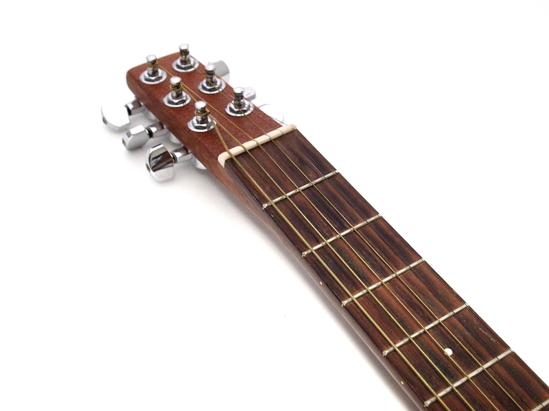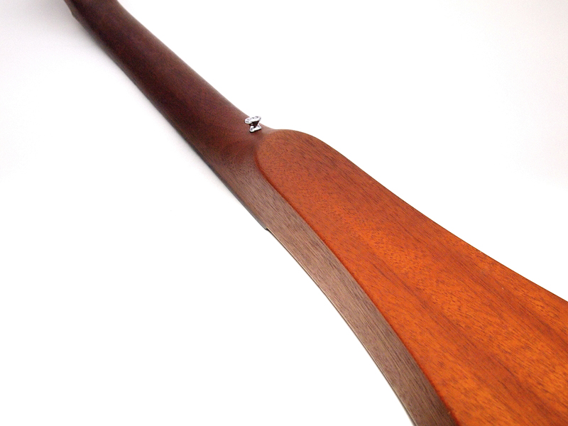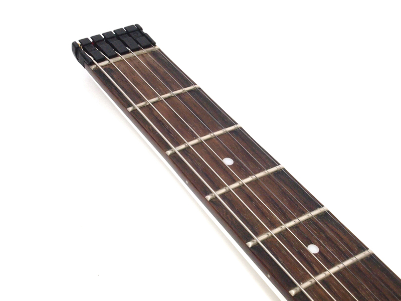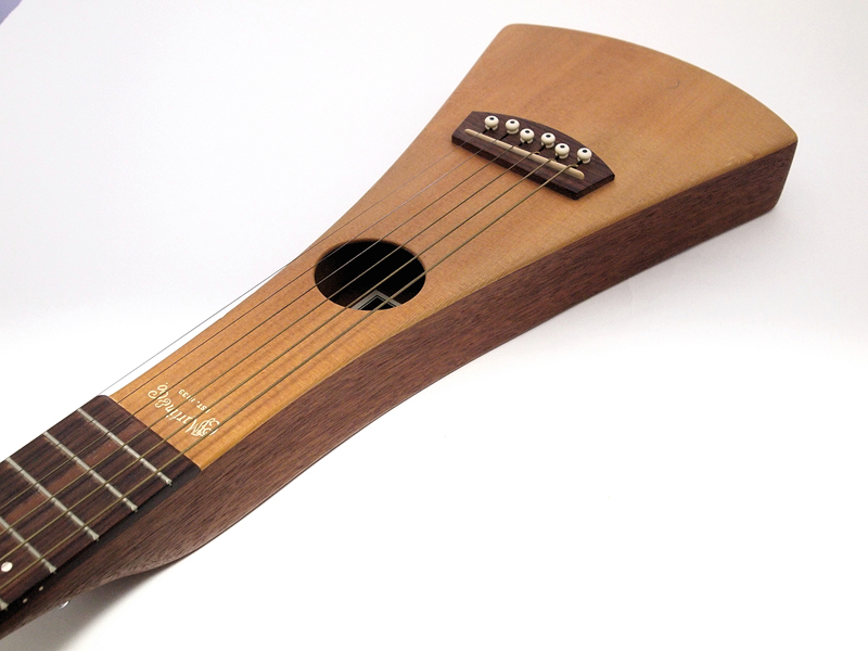 ●ギター、コンパクト化へのいくつかのアプローチ 旅に持っていきやすい、つまりコンパクトなので「トラベルギター」と呼ばれるギターは、実は、意外なほどたくさんある。それは、つまりは、ギターが結構大きい楽器だというか、大きさを必要とする製品だということ。そこに「小さくする」という工夫の余地が生まれて、製品のデザインに対するアイデアも生まれる。だから、いわゆる「良い音」を追求する楽器としての良し悪しとは違う、モノとしての面白さと、できれば楽に持ち運んで、あっちこっちで弾きたいという希望の上に、1つの価値観が生まれているのが、「トラベルギター」というジャンルではないかと思うのだ。 ウクレレも、元々は携帯性の高いギター的な伴奏が出来る楽器として作られたらしいし、三味線は、棹(ネック部分)を分解して胴の中に入れて持ち歩けるタイプが江戸の昔から存在している。ウクレレの場合は、全体をスケールダウンして、弦も4本にすることで、スケールダウンした分、ネックが細くなることに対応するというアイデアだし,三味線は要するにネックが長いことが問題だと考えている。ギターに対して携帯性を考える場合、やはり、この2つのタイプが基本のアイデアになるのだと思う。さらに、もう1つ、ギターがアコースティック楽器、つまり共鳴させるための胴が必要、という部分を諦めてというか、音はマイクで拾って拡声しようというアイデアもあって、こちらは、ヤマハやアリアプロ2などで製品化している。つまり、全部ネックでいいじゃないか、という「細い」方向でコンパクト化するアイデア。 ●アコースティックを持ち歩く まず、ネックを分解するというスタイルだが、楽器そのものの形や大きさを変えずに、一番小さく携帯できるのは、多分、この方法。ただ、この方法は、持ち運ぶには便利だけれど、演奏可能な状態に戻すのに時間がかかるという欠点がある。この欠点は意外に大きくて、つまりは、弾きたいと思った時に弾けないのだ。ネックを組み立てて、弦を張って、という作業を毎回強いられるのは、かなり厳しい。特に、弦を張る作業というのは、結構面倒くさくも大変なのだ。三味線のような、比較的弦の張り替えが楽な楽器でさえ、基本的には、1日に何度もネックを組み立て直すことは奨励されていない。また、木工工作の精度が必要だし、強度も考えなければならない、ということで、かなり趣味性が高いアイデアで、実際にギターを作ったとしても、かなり高価になってしまうだろう。 スケールダウンは、しかし、ウクレレくらい小さくしてしまうと、別の楽器になってしまうのが問題だ。バイオリン、ヴィオラ、チェロ、ダブルベースと、楽器のサイズが変わると名前も変わるのがアコースティック楽器の世界。せいぜい、フレットをミディアムスケールにして、多少ネックの長さを短くする程度が限界だろう。あまりにネックが短く、細くなると、相当弾きにくい上に、チューニングも狂いやすくなるのも問題だ。それでいいなら、ウクレレを持ち歩けばいいと言うことでもあるし、無理にギターである必要もない。 細くする方向では、マーチンの「バックパッカー」という有名なトラベルギターがある。見れば分かるが、胴をとにかく細く作った(写真01)アコースティックギターだ。ヘッド(弦を巻き付けるペグが付いている部分の総称)も小さくなっていて(写真02)、全長も結構短い。軽いし、マーチンのメキシコ工場製で作りもしっかりしていて(写真03)、多少弾きにくいところはあるけれど、旅に持って行くのにとても良いデザインになっていると思う。ただ、まあ、小さくはない。ギターとしてはコンパクトというだけだ。ただ、この「バックパッカー」のように、ギターのまま、なるべく小さくする、という方向は、それはそれで可能性のあるデザインだと思うのだ。