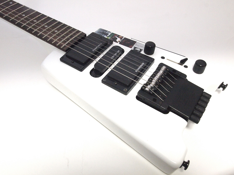 ●エレキギターの場合 エレキギターの方では、「スタインバーガー」という、とてもコンパクトなギターがある。ヘッドがなくて(写真04)、ボディはギターとしてギリギリの大きさというか形というか(写真05)、ブリッジ(弦を下部で支えている部分)とピックアップ(マイク)とボリュームなどのスイッチ類がギュウギュウに詰め込まれている感じの小さなボディ。これは、本当に小さい。ただ、このギター、別に旅用にコンパクトに作られたのではなく、弾きやすさや、チューニングの安定、タイトな音などを実現するためにデザインされたもので、オリジナルモデルは温度や湿度の影響を受けないようにグラスファイバーで作られていたほどの、「真面目」なギターなのだ。形は変わっているし(写真06)、いわゆるトラベルギターよりも小さかったりもするので、持ち運びとか、とても便利だけど、アプローチが違う。ただ、この、「ヘッドレス」というアイデアは、その後登場するトラベルギターにも採用されていることもあるし、かつて学研の「大人の科学」で付録に付いていた、ウクレレサイズのエレキギターでも採用されていた。 他にも、普通のギターよりも大きいくらいだけれど、アンプもリズムボックスもチューナーも内蔵して、これ1本でいろいろな演奏が楽しめるオールインワンをもって「トラベルギター」と呼んだ、VOXの「Apashe II」は、この連載でも取り上げたし、日本が誇るアンプ内蔵ギター、フェルナンデスの「ZO-3」シリーズは、アンプ内蔵の上に、ミディアムスケールの短いネックと、座ったままで弾きやすい独特なコンパクトなボディで、「トラベルギター」の名前に相応しい出来。ただ、何故か「ZO-3」は、あまりトラベルギターと呼ばれないのは、もしかしたら、そのユーモラスなデザインが、「旅先でギターを弾きたい」という欲求が目指す光景に合わない、と思う人が多いからかも、と思うのは邪推だろうか。