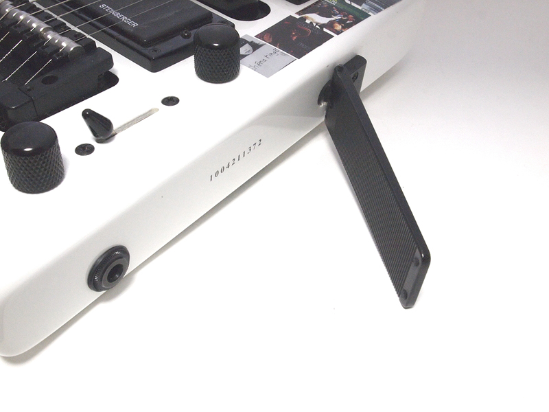 ●ストラト進化系? そして、ESPの「Grassroots ピックガードギター」こと「GR-PGG」(写真07)も、トラベルギターの新しいデザインの1つだと思う。これ、何かというと、ストラトキャスターというフェンダー製の名作エレキギターがあるのだが、そのピックガード(演奏中にピックなどがボディに当たっても木製の本体に傷が付かないように守るプラスチック製の板)部分から切り取ったような、心理学でいう主観的輪郭線を誘発するような、不思議な形をしているのだ(写真08)。ただ、その特殊な形状のおかげで、ボディはとても小さい。それこそ、スタインバーガーくらい小さい。だから、とても軽い。ただ、ネックはフルスケールだし、ヘッドもストラトキャスターのコピーだから、それなりに大きい(写真09)。そのせいで、普通のギターよりも確かに小さいし、相当軽いけれど、スタインバーガーと比べたら、ヘッドの分大きい。