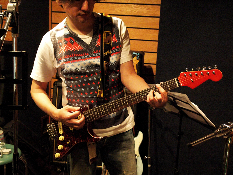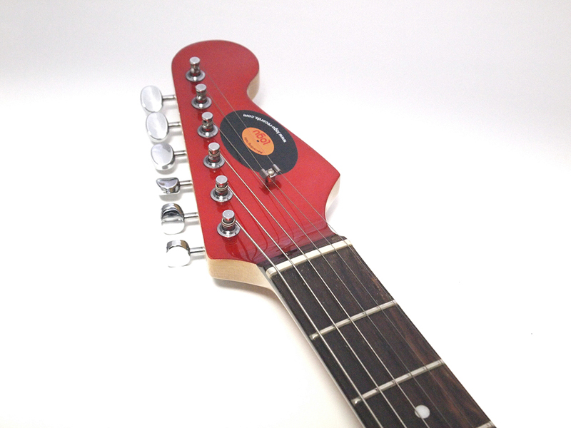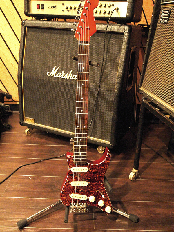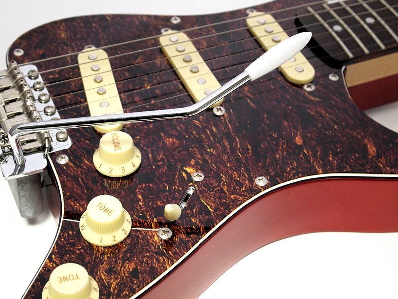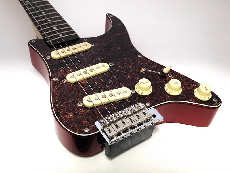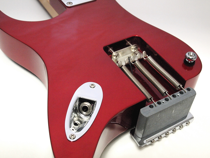 面白いのは、こんなフザケた形なのに、ディテールは徹底的にストラトキャスターを踏襲していること。スイッチやつまみ類はもちろん、ピックアップ、ピックガードのデザイン、さらには、本来切り取られた部分に付いている出力のコネクタは、背面に、ちゃんとストラトキャスターと同じ部品を使って装着(写真10)。ストラトキャスターの最大の特徴の1つであるトレモロアームも付いている凝りよう。そのトレモロアームを実装するために、ブリッジ部分は本体からはみ出す形で取り付けられているのも面白いのだ(写真11)。その、遊ぶからには徹底して真面目に遊ぶ、というような姿勢が楽しい。この姿勢は、従来のトラベルギターにはないものだ。 また、ストラトキャスターは軽くてウェイトバランスが良いのも特徴の1つだが、このピックガードギターでも、重心の位置などが考えられていて、実際に持ってみると、とても軽く感じられる(写真12)。コンパクトさでは負けているスタインバーガーと比べても、持った時の軽快さは、ピックガードギターの方が上だ。また、弾いてみると、本当にストラトキャスターっぽいし、音も、下手に弾くと下手がバレやすい、ストラトキャスターならではの、粒立ちの良いストレートなもので、筆者などは必要以上にディストーションを掛けて誤魔化すしかないような、スムーズで良い感じの音がする。この感じがまた、旅に持っていきたい、と思わせるムードを醸し出す。 色は、写真のべっ甲柄のピックガードにキャンディ・アップル・レッドのヘッド、ローズウッドの指板、クリーム色のピックアップ・カバーとつまみの、60年代レアカラーを狙ったモデルの他、黒のピックガードに白のピックアップ・カバーとつまみ、ローズ指板に裏は3トーンサンバーストという、60年代初期のストラトキャスターを意識したモデル、白のピックガードにメイプルネック、裏は黒という50年代のスタイルの3種類。どれも、渋いラインを狙ったカラーリングで、ここにも遊び心というか、面白いギターを作ろうという意志を感じるのだ。持ち歩くなら、持ち歩いて見せびらかしたいという部分も、やはりあって、その意味でも、このピックガードギターは「トラベルギター」だな、と思う。 さらに、付属の専用ケースも、持ち歩くための利便性が考えられていて嬉しい。肩掛け、背負いの両対応なのは最近のソフトケースでは当たり前だが、さらに、短さを考えて、上から持つことができるハンドルが付いている。これが、電車に乗っている時に、他の型に邪魔にならないように、身体の前に立てている状態から、スッと持ち上げて降車できるので、とても便利なのだ。もちろん、ギター自体も軽いから、持ち上げるのもスムーズ。ハンドルがちょうど重心のところに付いていて、持つと水平になるのもギターケースの伝統を守っている感じで嬉しい。