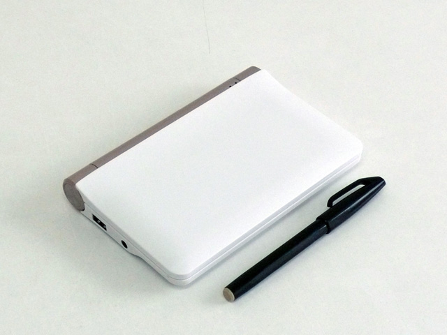 ●NetWalker誕生の背景 モバイルインターネットツールと銘打つNetWalkerだが、シャープはこういった小型携帯端末として、以前はZaurusシリーズをリリースしていた。その後はウィルコムのW-ZEROシリーズやWILLCOM D4などスマートフォン系を送り出していたが、NetWalkerはそういったシャープの携帯端末に対する想いを受け継いだ最新版ということができるだろう。 現在、このサイズの携帯端末は、MID(Mobile Internet Device)、スマートブックなどと呼ばれるが、PDAと呼ばれていた時代のZaurusシリーズとの違いは何か。大きくは、現在は大都市やオフィス街のカフェなどでWi-Fi環境が当たり前となってきており、それに対応すべく無線LAN内蔵マシンになった点といえる。 なお、ソフトウェアやハードウェアに関しては各種IT系メディアに詳しいので、ここで詳細は省略するが、CPUに「Freescale Semiconductor社製 i.MX515 マルチメディア・アプリケーション・プロセッサ」、OSに「Ubuntu 9.04(ARM版スマートブックリミックス、シャープカスタマイズ版)」を用いたLinux系のマシンであり、WindowsやMacなどの一般的なPCではないことをお断りしておく。 ●NetWalkerの外観 本体は、折りたたむと文庫本サイズ(A6)をやや大きくした感じで、ネットブックよりはグンと小さく、iPhoneなどのスマートフォンよりは大振りだ。 このサイズのマシンは、Zaurusや古くはシグマリオンといったキーボード搭載モバイルマシンの流れにあり「キーボードによる文字入力やテキスト編集が可能な最小クラス機」に分類される。構造はノートPCと同じで、二つ折りの本体を開けばディスプレイ(5インチ)とキーボードが現れる。 ボディ全体は、ヒンジから前面に向けて滑らかな曲面で体積のスリム化を図っていてコンパクトな印象だ。表面は光沢のある仕上げが施されているが、裏面はマット系の質感で処理されている。持ち運ぶときなど、さすがにワイシャツの胸のポケットへの収納は無理だが、上着やズボンのポケットにはスムーズに入れられる。ただ重量は約409gとなっており、ポケットに入れたときに重さは感じる。 デザイン的なポイントとしては、ヒンジ部分の円筒にある。ここには充電式バッテリーが収納されているが、もう少し直径の細い円筒であれば、全体のデザインバランスもより優れた印象になったかもしれない。 本体カラーは白、黒、レッドの3色が用意されている。いずれも落ち着いた色調の仕上げだ。ユーザーにはビジネスマンやプログラマーを中心にブロガーや就職活動中の学生などが見込まれるため、インテリジェントツールとしての色合いを意識したカラーバリエーションという印象を受けた。