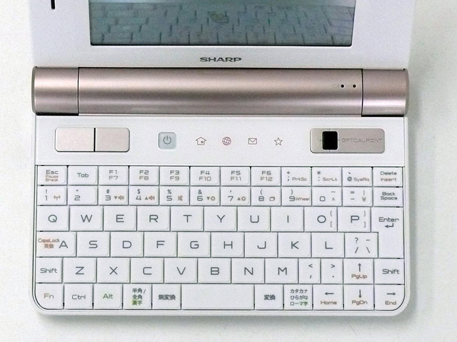 ●キーボードとポインティングデバイス さて、本体のふたを開けるとディスプレイとキーボードが現れる。ディスプレイは「タッチパネル付5型ワイドTFT液晶(WSVGA対応、LEDバックライト)」で1,024×600ドット(最大65,536色)の解像度を持つ。5インチで横1,024ドットの解像度はかなり精細で、標準フォントでは、年配の方など文字が小さく読みにくく感じる人もいるかもしれない。その場合はフォントサイズの設定を変えれば問題ない。 キーボードは面積いっぱいにキーピッチ約14ミリの68キーが並んでいる。キーピッチ14ミリというのは、タッチタイプを行うにはやや狭く、両手で本体を持って行う「親指打ち」にはやや広い。逆に言えば両方の打ち方が可能でもあるのだが、親指打ちするために本体を持つとディスプレイ部分が重く感じ、ややバランスが悪い。これも慣れの問題だが、基本はデスクやテーブルにおいてタイピングする使い方が良いだろう。 キーストロークはサイズの割にはやや深めに感じる(約0.8ミリ)。また各キートップにはパンタグラフの支えがないため、上下左右に若干グラつき感があり、キートップの中央部を押さないと入力を認識されない場合がある。筆者の場合は、本原稿を執筆するうちに気にならなくなった。独自のキータッチではあるが、指先が感覚を覚え、長文入力もストレスなく行えた。ただ68キーしかないため、記号などの入力はFnキーを押しながら行う場合が多いので、最初は戸惑うかもしれない。 このキーボードの優れているところは、クリック感を保持しつつ、クリック音を最小限に抑えている点だ。こういった携帯端末はあらゆる場所での使用が想定されるので、たとえば図書館や深夜のベッドサイドなど、静かなところで他の人に気兼ねなく使えるのは嬉しい配慮といえるだろう。 またNetWalkerには、マウスやタッチパッドに代わるデバイスとして、キーボードの右上に「オプティカルポイント(光学式ポインティングデバイス)」が用意されており、これでカーソルを操作する。マウスの左クリック/右クリックに相当する部分はキーボードの左上にあるため、カーソルの位置移動とクリックの作業には両手が必要になる。 オプティカルポイントの精度は高く、親指で表面をなぞるだけで、カーソルを思いのままに動かせる。またディスプレイはタッチパネル対応なので、指で直接カーソルを操作することも可能だ。 ●バッテリー駆動など シャープの仕様一覧によると、バッテリーの駆動時間は約10時間、充電時間は約3.5時間となっている。実際に試用してみたところ、比較的早く「バッテリー容量:中」の表示が出るが、「バッテリー容量:低」までの時間は長く、「低」になってからもけっこう使い続けられる。実使用で10時間までは持たないまでも、ハードな使い方をしなければ、1日のビジネス用途でバッテリー切れになる心配はないだろう。 また使用中に本体が熱くならないのもメリットだ。一般のノートPCやネットブックなど、CPUの発熱をファンなどで放熱する必要があるが、NetWalkerの場合はファンレスでありながら、長時間両手で持っていても熱く感じることはない。これはモバイルツールとしては見逃せない長所で、目に見えないデザインといえるだろう。 惜しむらくは充電アダプターがノートPCと同様のタイプで、出張など持ち運びにはやや嵩張る。Zaurusの場合は携帯電話の充電アダプターと同じコンパクトなタイプだったので、この点は残念だ。 ●NetWalkerデザインの狙い いまやインターネットのブラウズやメールの送受信は、携帯電話やiPhoneなどのスマートフォンで十分であり、それらとノートPCやネットブックを持ち歩けば、出先におけるビジネス用途に困ることはないだろう。 ではNetWalkerの存在価値はどこにあるのかといえば、これはおそらく、ノートPC/ネットブックに代わるデバイスに位置付けられる。 NetWalkerの本質は、テキスト入力/編集に特化したモバイルマシンではないだろうか。ソフトウェア的にもOfficeと互換性の高い「OpenOffice.org 3.0」がプリインストールされており、ワープロ、表計算を主に用いるビジネスマンやSEには必要十分の道具が用意されている。 NetWalkerは企画書など各種文書作成に関わるビジネスマン、プログラマー、記者や小説家などの文章のプロフェッショナル、さらにブロガーや学生などをターゲットにデザインされたマシンだ。いつでもどこでも、思い立ったときにテキストや数値を入力でき、そしてネットに接続できる環境を気軽に持ち歩けるのは、思いのほか便利なものである。 最後になるが、特筆すべきは起動の速さだ。サスペンドからの復帰は電源ボタンを押してから約3秒で操作可能になる。例えば電車の中で、ふと思いついた用件やアイデアを書きとめておきたいときなど、非常に便利だ。一般的なノートPCなどではレジュームの復帰時間でも10秒程度は掛かるので、NetWalkerの軽快感は唯一無二かもしれない。 Netwalkerは外見やサイズだ