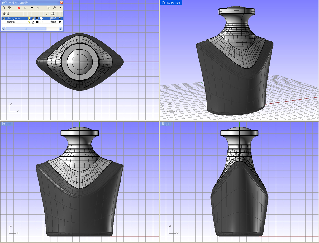 まず、HayabusaモデラーであるRhinoceros4.0上で、クロームとガラスのマテリアル設定を想定し、レイヤーを分けておく(fig-1)。