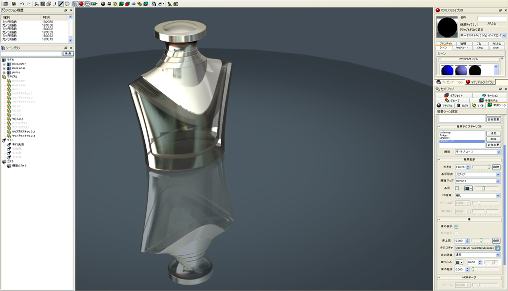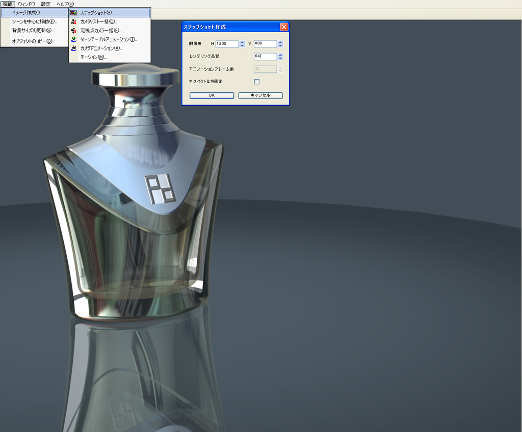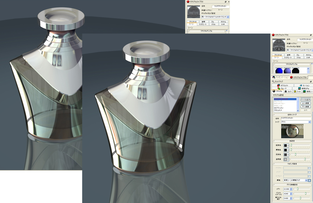 今回は、前回のファーストインプレッションで気になっていたクローム(メッキ調)の質感、ガラスなどの透明材質の質感を確認するため、男性用化粧品のボトルを模した形状データを使ってレンダリングを検証してみる。