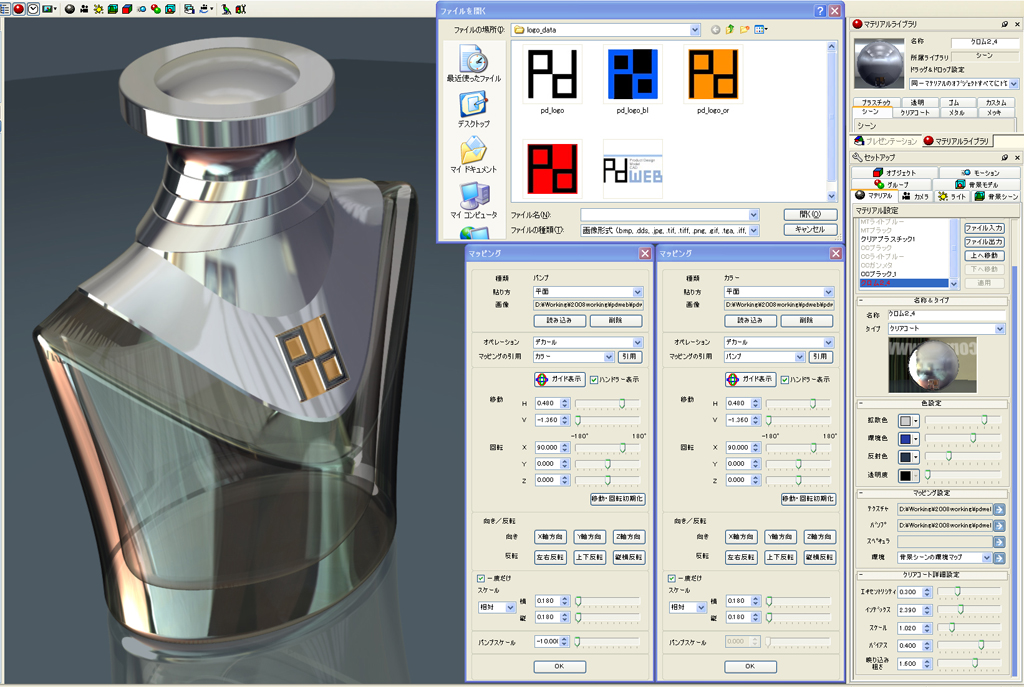 Hayabusaでは、ロゴマークやグラフィックスを配置できる「デカールマッピング」もリアルタイムでレンダリングできる。今回はサンプルとして、「pdweb.jp」の「pd」ロゴを凸文字で表現してみた。「マテリアル設定」内の「マッピング設定」で、「テクスチャ」としてカラーのロゴマークを配置し、「バンプ」としてモノクロのロゴを配置する。バンプを凸として表現する場合は「バンプスケール」を「-」の値にする。もちろん、この凸部分もリアルタイムにレンダリング表現される(fig-5)。