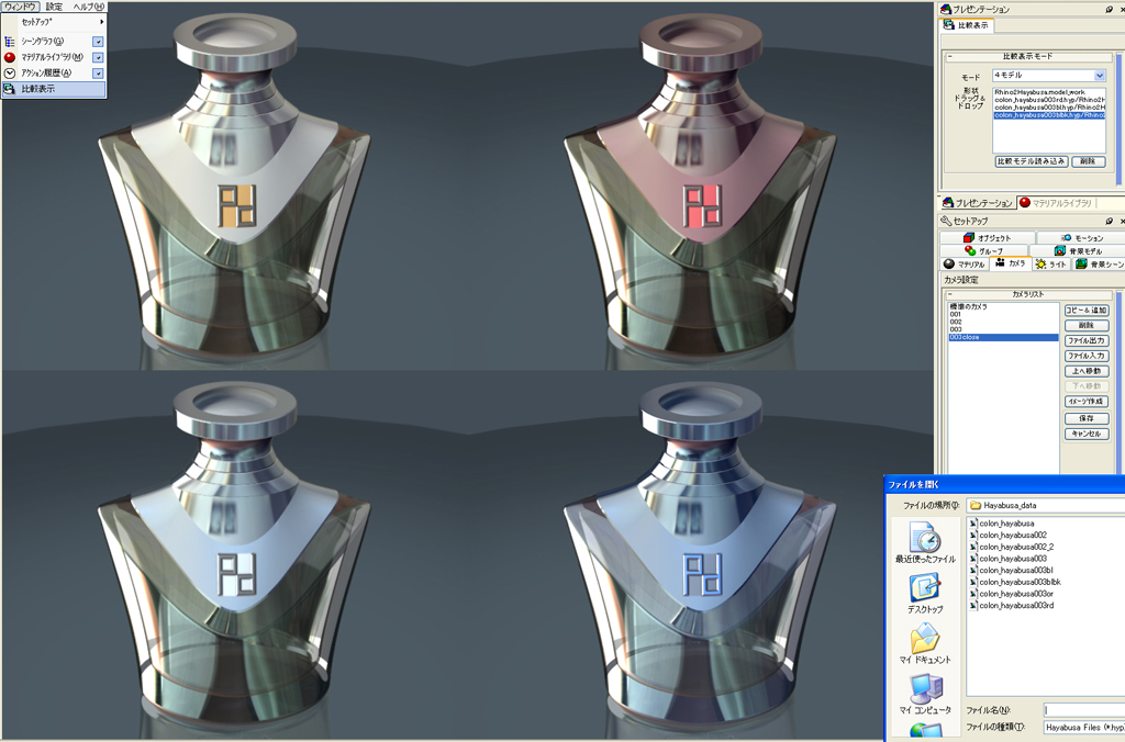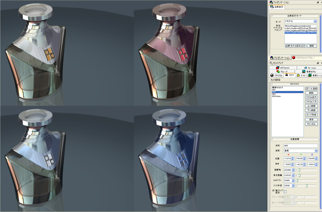 Hayabusaではプレゼンテーションや開発途中の比較検討用に、同時に4画面表示することができる。「プレゼンテーション」の「比較表示モード」の「モード」から「4モデル」を選び、あらかじめマテリアル設定された比較モデルを順に読み込む(fig-6)。