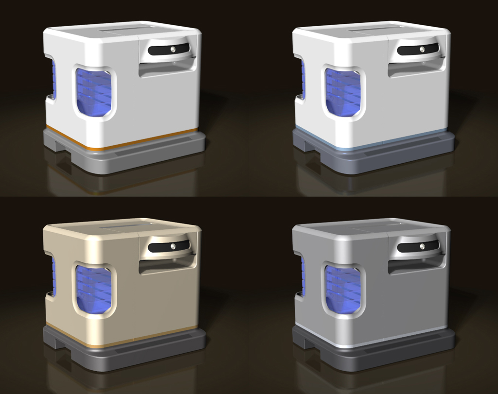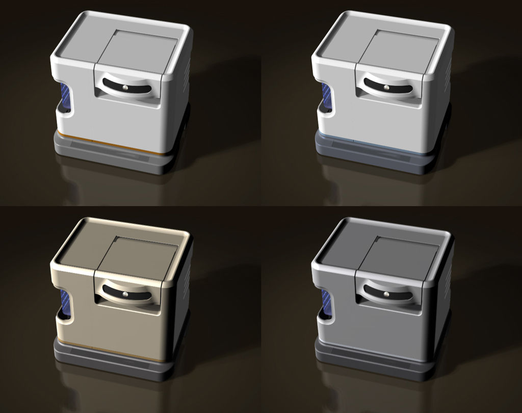 「4モデル」を、家電製品を模した別のモデルで試してみる。プラスチックの本体、水を入れるクリアなボトル、金属のノズルなど、さまざまなマテリアルが混在する製品のカラーバリエーションの比較をしてみた。かすかに床に反射する製品の像も、ソフトシャドウも、リアルタイムでレンダリングされる(fig-8、9)。