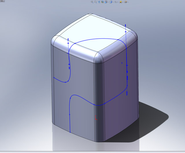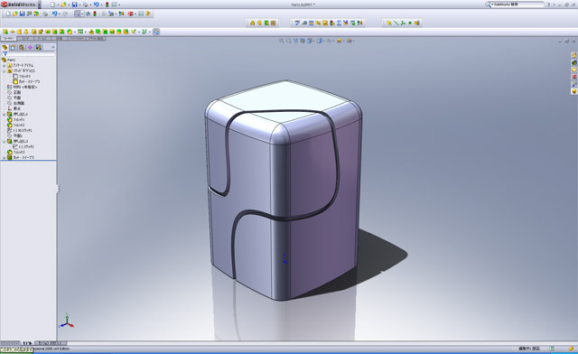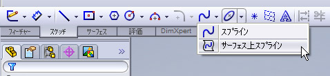 SolidWorks2008では、この3Dスケッチ機能に、「サーフェス上スプライン」が追加されている。これは、文字どおり、モデリング中のオブジェクトの面上に直接スプラインカーブが作成できる機能である。Rhinocerosなどのサーフェスモデラーでも使われるコマンドではあるが、SolidWorks2008の場合は、1枚の面にカーブを描くだけではなく、正接しているサーフェス同士であれば、そのまま複数のサーフェス上を連続してカーブ作成できる点で優れているように思う。投影カーブを作成するにも、どの平面にスケッチを作成して投影すればよいのか判断しにくいときや、感覚的に面上に曲線を作成したときなど重宝しそうな機能である。