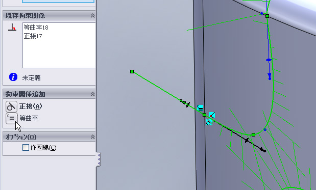 別のスプラインを連続させる場合、「正接」だけでなく「曲率」を一致させることもできる(クリックで拡大)