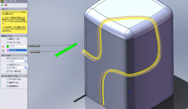SolidWorks2008では、このスイープカットコマンドに「ソリッドスイープ」という機能が追加された。