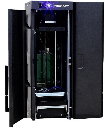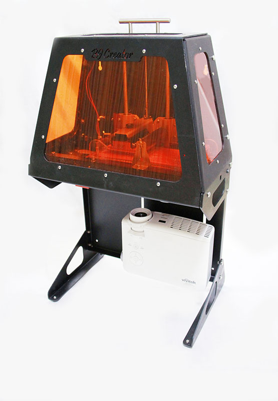 世界初廉価版光硬化式3Dプリンタ。液体状の光硬化樹脂を使ってプロジェクターから投影される分割スライスされたデータを元に光硬化樹脂を一層ずつ固めながら立体を造形していきます。液体の中から立体が浮き出てくるように見えるのでそれはまるで不思議な世界からの贈り物のようです。積層ピッチは最小25μm〜最大100μmまでセッティングが可能。光造形ならではのきめ細かな立体造形をお楽しみいただけます。