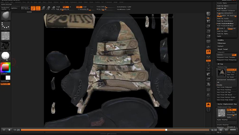 ZBrushを使用することで、まったく手を汚すことなく粘土に非常に近い感覚でスカルプト(彫塑)ができます。通常の3Dモデリングでは表現の難しい皺やクロスなどの繊細な質感も簡単に作成可能です。