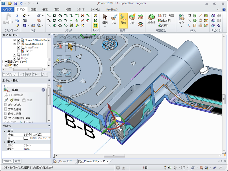 ・断面表示、3面図表示を使い分けながらモデリングできるので、複雑なデザインの内部構造を試しに変更しながらぎりぎりの検討を、メカ系エンジニアとデザイナーがリアルタイムコラボできます(図参照)
