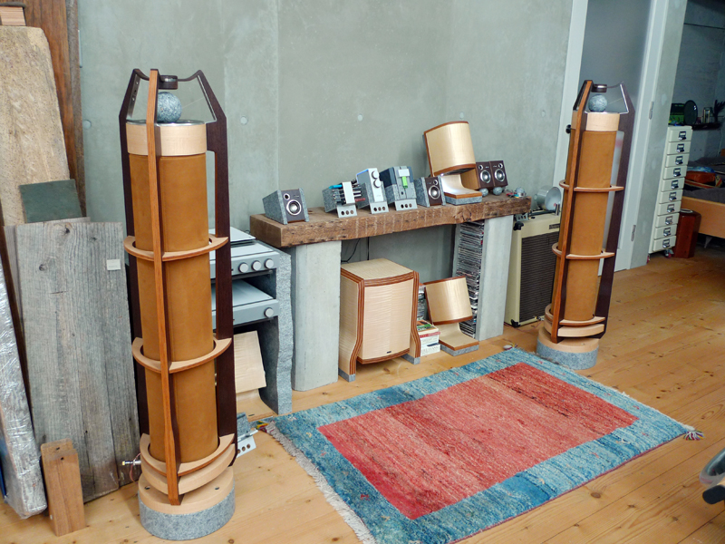 石川氏のアトリエに並ぶAZiSオーディオのラインアップ。両端の円柱型スピーカーは、無指向性のCUE。(クリックで拡大)