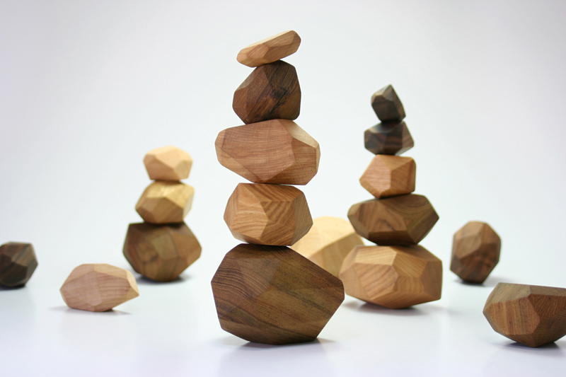 子供から大人まで楽しめる積み木のおもちゃ。自然の石のようなゴツゴツした木をバランスをとりながら積み上げる積み木。多面体にカットされた木が程よい難しさを生み出し、色や形、重さを、身体で感じとることで、創造力やバランス感覚を養う(クリックで拡大) |