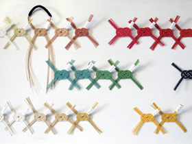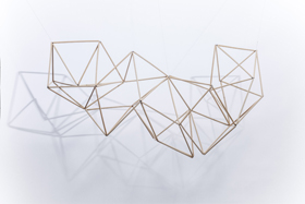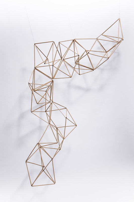 ○コンセプト:これは竹の筆軸から成るオブジェです。およそ300gと軽量で、テグスなどで簡単に吊ることができます。軸と軸の間が関節の役目を果たすため、吊る箇所と数によって形が変わり、照明と組み合わせると幾何学の影を落とします。花を生けるように、空間に生けてください。