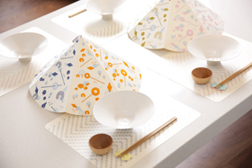 ○コンセプト:美濃和紙の可能性をもっと拡げるために、今までにあまり使用されていないシーンにもとけ込ませることを考えてデザインしたテーブルウェアです。「山のフードカバー」「道のランチョンマット」「川のはしおき」の3点のシリーズで、テーブル上に美濃の風景を再現するかのように演出できるテーブルウェアです。3つの商品すべて、四季をイメージした4カラーの展開になっています。