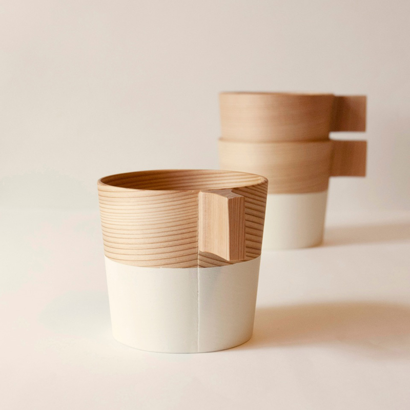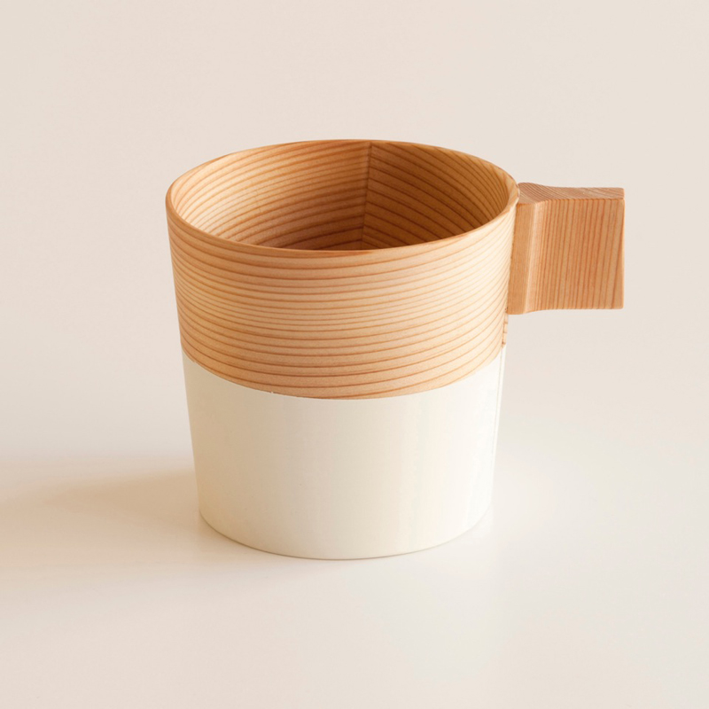 ○一言:曲げわっぱの技術を活用するにあたり、取手の木工部分は1つひとつ削り出していく手法で製作されています。持ちやすく、作りやすく、丈夫であるものを考えました。また多くの方々に使っていただけるようなカップにしたいと思っていましたので、和を払拭できるバランスを考え、使っていただきやすいようスタッキングができるカップに仕上げました。