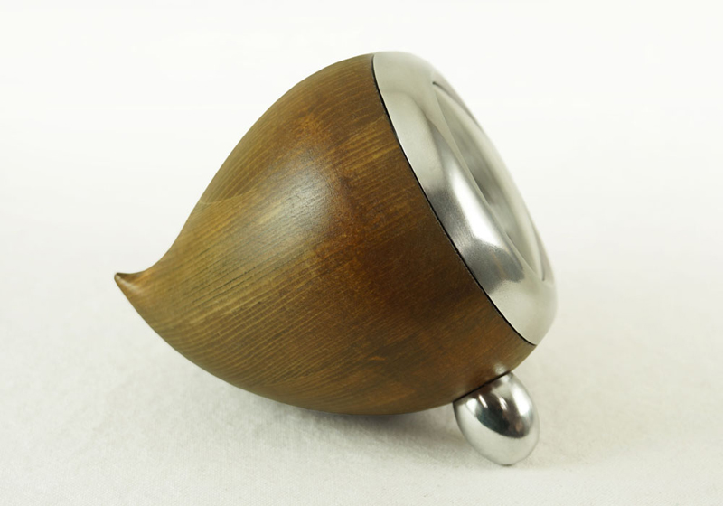○一言:企画デザインから制作まで一貫して行える弊社の強みを生かして、自由な発想で作ったプロダクトです。作品に重厚感を持たせるために、クロックの概念を超えて金属部分の文字盤とインデックスは、ジュラルミンの無垢材から一体で立体的に削り出しています。天然木は生き物なので、木製ボディの3次元での切削にはかなり試行錯誤しました。