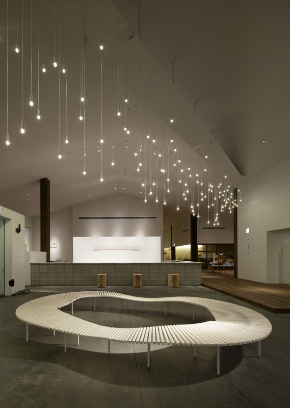 ○コンセプト:鈴鹿山麓にある温泉施設ロビーに設置のため、照明は星のまたたき・ベンチは水面をイメージし、安らぎのもてなしを表現。