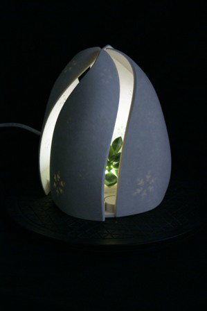 照明器具のイベントに出品したときの事例。サーフェスモデラーでデザイン/モデリングし、石膏の粉碓積層により実体化して出品(クリックで拡大)