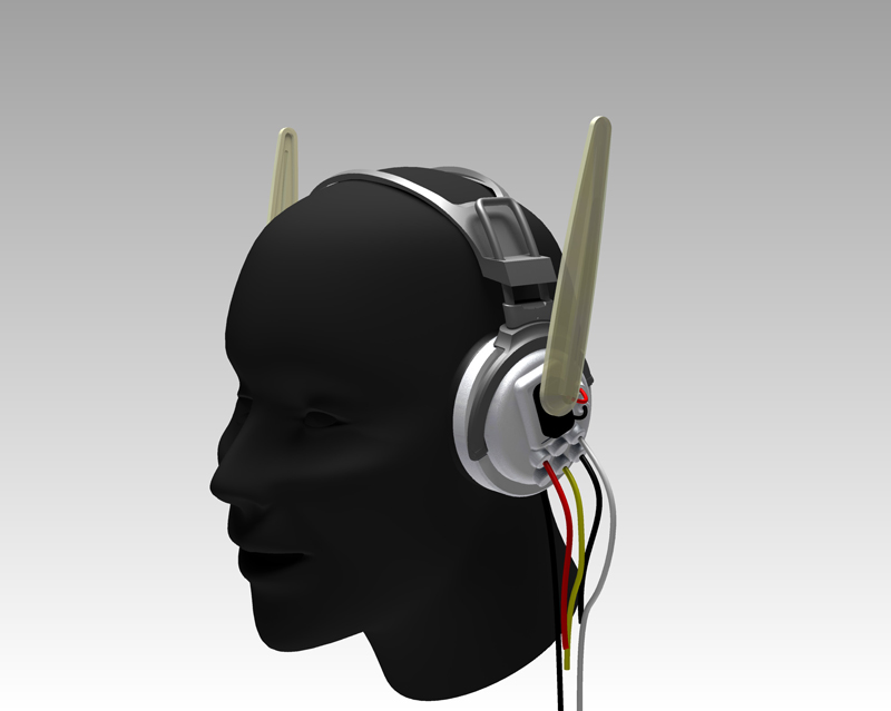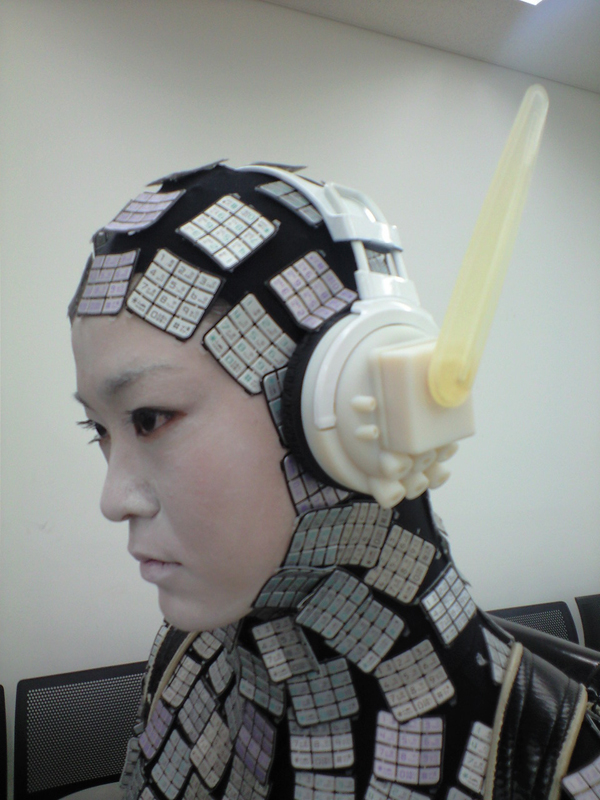 アートパフォーマンス「ケイタイガール」プロジェクトでガジェットデザインとしてヘッドセットをデザインし、ナイロン焼結積層により、実体化し使用した事例(クリックで拡大)