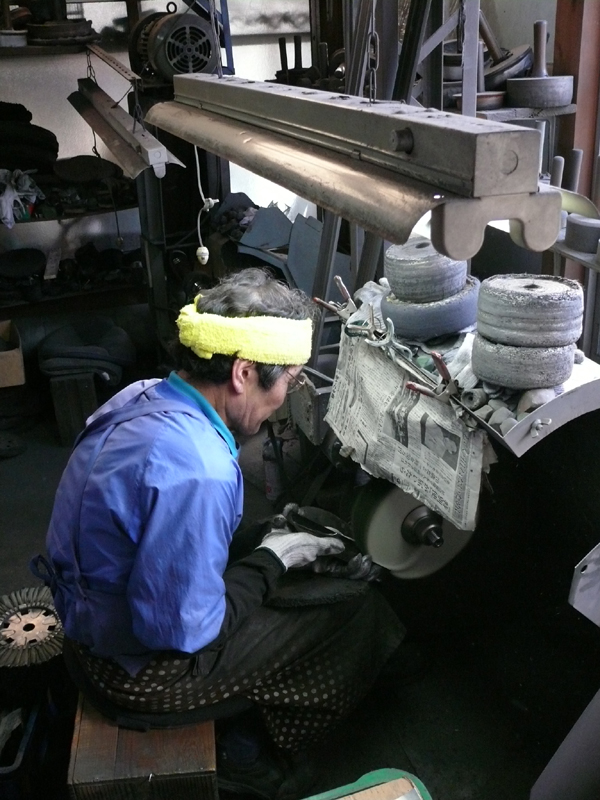 職人さんの手によって1枚1枚が丁寧に磨かれる。磨きは、目の荒いやすりから仕上げのやすりまで、4工程に分かれる(クリックで拡大)