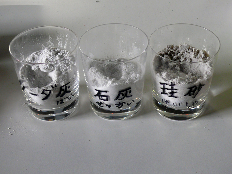 硝子の原料。左からソーダ灰、石灰、珪砂(クリックで拡大)