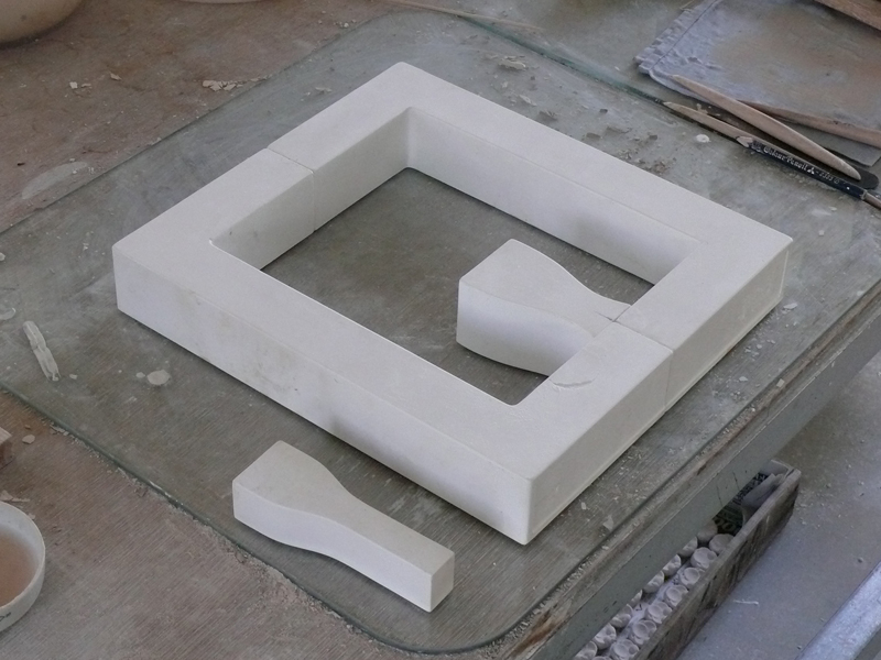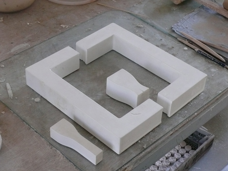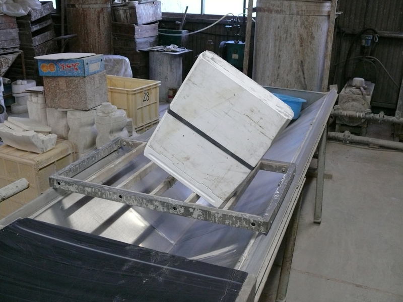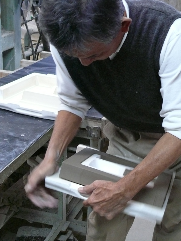 鋳込み型(不定形なモノを割り型で作るもの)の場合は、80個くらい製品を作ったら捨ててしまいます。石膏が減ってきて多少モノが大きくなったり、レリーフがあるものはそれが甘くなったりします。ですから1,000個注文があると15個くらいの型を作ります。マスター型があればいくつでも使用型はできます。