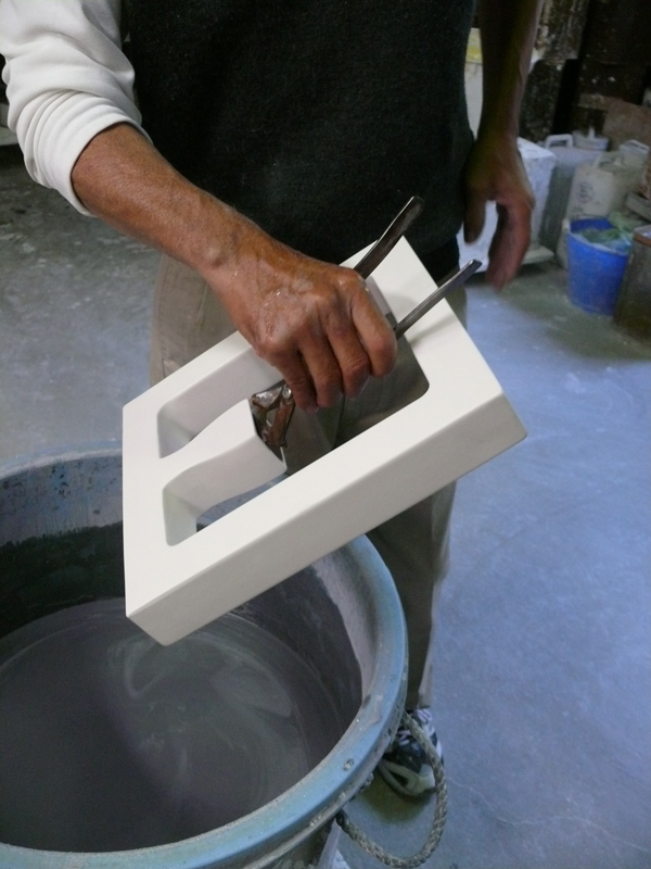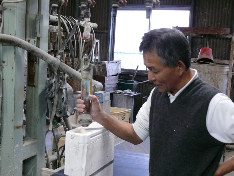 以下マサキクラフトでの製作工程。型に泥漿を注入する(クリックで拡大)
