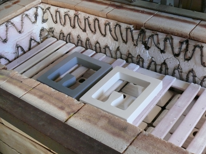 大橋:型から出したばかりのものは黒くてまだ柔らかいです。これを少し乾かしてバリや型の割れ目をきれいにして、700〜800℃で素焼きします。そうしたものに釉薬をかけ、その後、磁器の場合だと1,300℃くらいで本焼成をします。