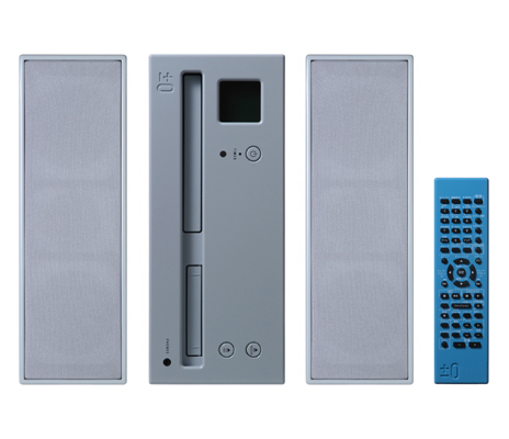 1stコレクションの「DVD/MDステレオコンポ」。直方体の積み木を組み合わせたような形の静かなデザインのオーディオ。光沢の表面もきれい。ほとんどの操作はリモコンで行うので、本体の操作キーは最低限のボタンしか付いていない(クリックで拡大)