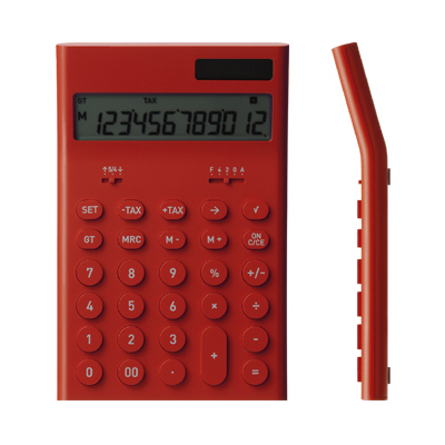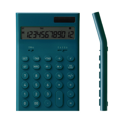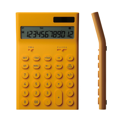 同じく3rdコレクションの「電子計算機M」。パスタや麺のように、平たいトラック形状を押し出して、その両端を鋭く裁ち落としたような形状。キーと本体は同色で、できるだけ複雑な要素を減らして、数字や記号が判読しやすくなっている。お店でもオフィスでも仕事が美しく見えるように。色は写真の5色(クリックで拡大)
