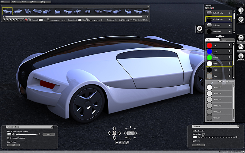 7.プレゼンテーション時には邪魔なウィンドウを非表示にし、サムネイル選択でマテリアル、カメラ、背景切替、ターンテーブル再生、アニメーション再生、最大4つの比較モデル同時表示を行うことが可能