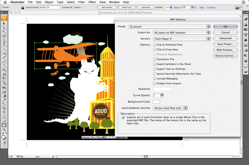 10.Flashのシンボル:シンボルを作成することで、ファイルサイズを抑えたまま、繰り返し使用されるオブジェクトをアニメーション化できます。アートワークの編集作業をさらにFlash CS3 Professionalで行う場合、シンボルオブジェクト属性を定義し、名前をつけて、プロパティを保存することができます