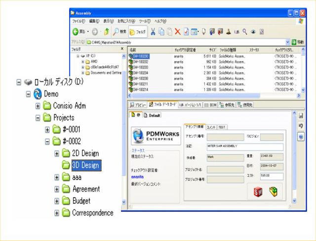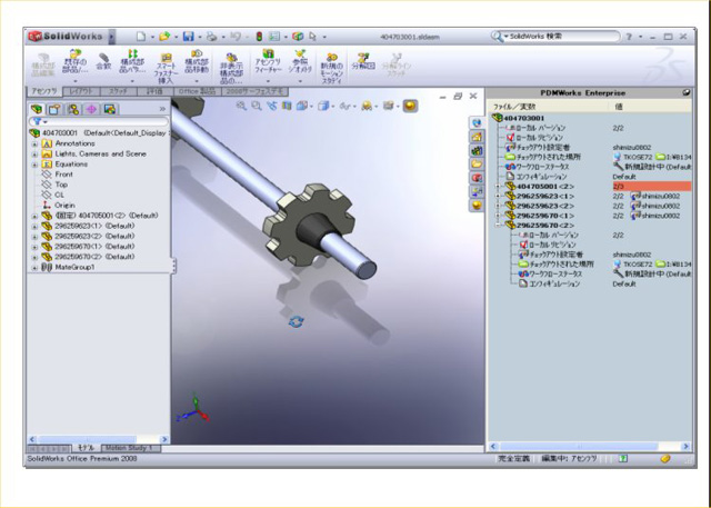 ●主なユーザー:本製品は、日本国内では2007年1月より販売を開始。2008年6月現在で国内400ライセンスと前年半期の2倍以上の成長。全世界でも同様の成長を記録している。その成長理由は明確で、CADとPDMのバージョンアップが同時に提供されることにより、システム管理が容易になること、設計者が最新のCAD機能をPDMを意識せずに利用できること、さらにもまして今までこれだけ統合されかつ容易に利用できるPDMが存在しなかったことなどが揚げられる。国内でも導入3カ月で実運用に至ったミクニ(自動車関連)をはじめ、SolidWorksを20ライセンス以上導入されている中堅企業で軒並み採用が決定している。