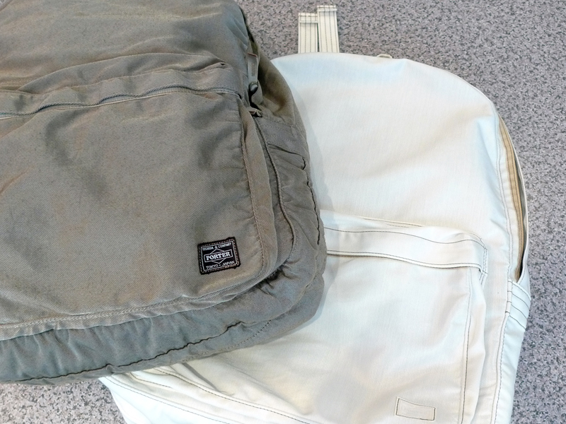 また、「PORTER OVERDYE」の場合は、ナイロンコットンの生地は、コットン部分しか染めてないので、ナイロン特有の質感が残っていて、光の当たり方によって光沢感の異なる微妙な雰囲気が出ていると思います。これはナイロンコットンの素材でしか出せない色味ですね。製品染めでしかできないことをやらないと面白くないなと思っていたのでこの生地を選んだんです。角度によって色合いなどの見え方がいろいろ変わりますが、色は黒、カーキの呼称にしています。グレーでもないし、ブラウン、ベージュとかでもなくて。