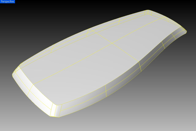 形状が複雑になってくると必然的にその形状を構築するためのカーブやサーフェスも増えてくる。実際の製品をモデリングするうえで、1本のカーブや1枚のサーフェスで完了することはきわめてまれなケースだ。複数のカーブやサーフェスを扱うようになる構成されるさいのそれぞれの“位置関係“が重要になってくる。Fig-30はキーボードの基本サーフェスを作成した段階のものだ。