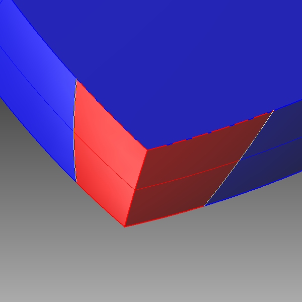 次に4隅の処理であるが、ここは単にシステムによってぼかし面(フィレットやブレンド)をかけるという考え方とデザイン的なぼかし処理(デザインR)をしようという考え方によってアプローチが異なる。前者の場合は、稜線にフィレット(徐変フィレット)やブレンド(徐変ブレンド)を挿入すればよい。