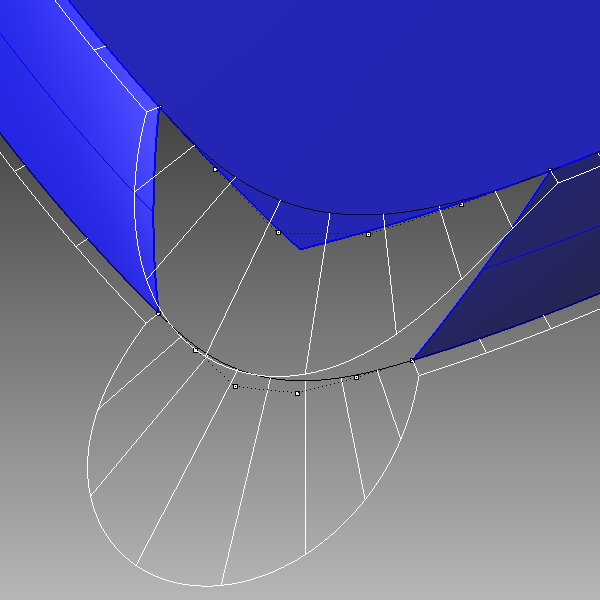 多くのソリッドモデラーではこのようなぼかし処理を行うが、どのようなサーフェス間に対しても、思うような形状のぼかし面が作成できるわけではない。システムが判断して作成するフィレットやブレンドは、多くの場合、作成できる形状は先の例のように簡単なものであるか、仮にできてもFig-35の形状のように、意図しないぼかし形状になってしまうことがある。特に、この例のように形状を構成するサーフェスがすべて自由曲面である場合はその傾向が強い。