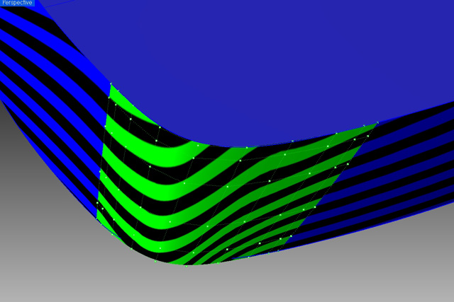 Rhinocerosでは、ぼかし面を作成する場合に、隣り合うサーフェスと1次連続(接線連続)になるものをフィレットと呼び、2次連続(曲率連続)になるものをブレンドと呼ぶ(曲率連続フィレットと呼ぶ場合もある)。Fig-34は、“BlendEdgeコマンド“で2次連続になるぼかし面を作成した例である。
