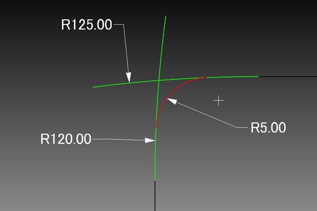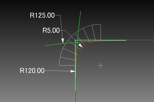 自由曲線という概念がなかった図面では、最終のR値を決める前にアプローチRという大きな半径値を持つ円弧を使用して、多少段階的に、R値を変えてぼかしを不自然なく行うように決める。Fig-43では、直線からそれぞれ半径125、半径120のアプローチRを作成した状態である。